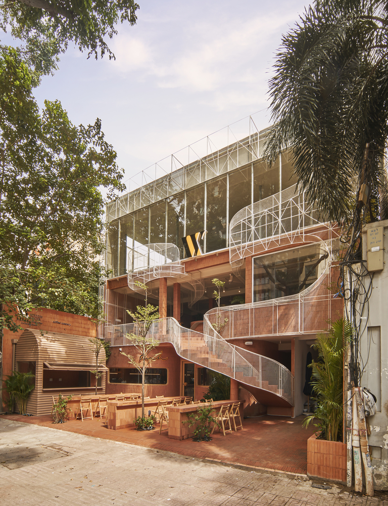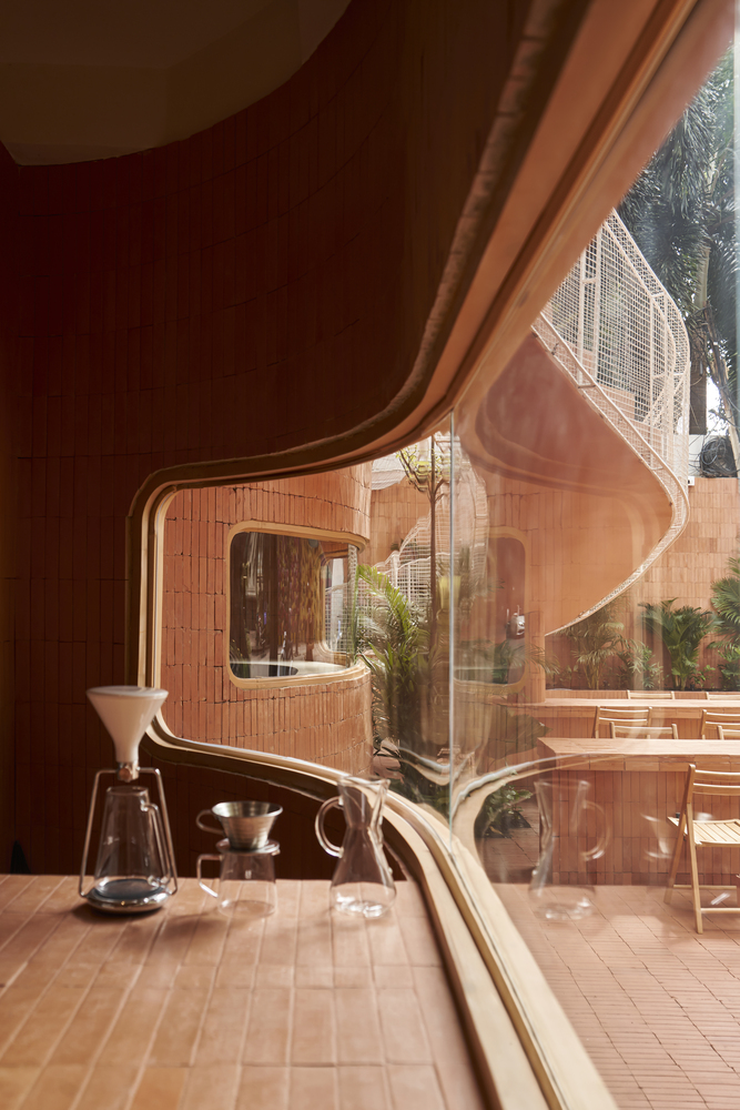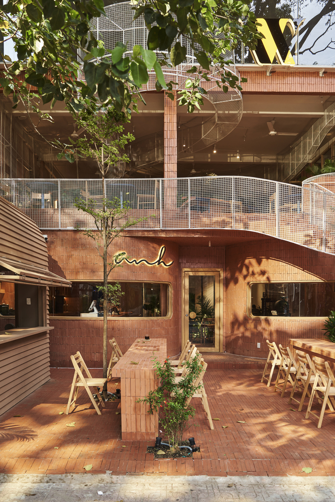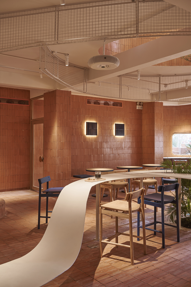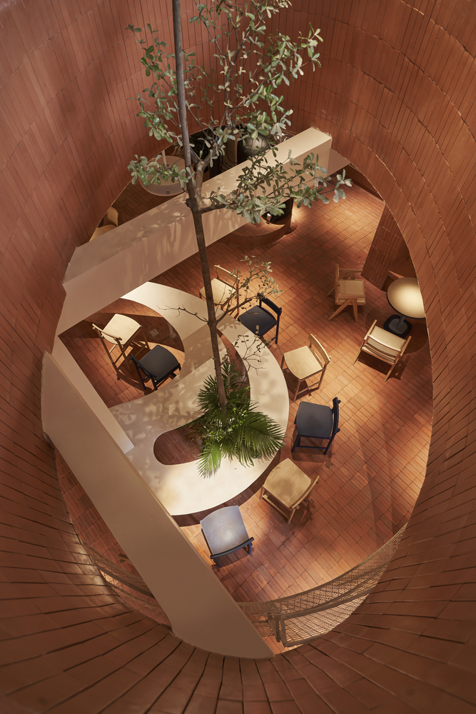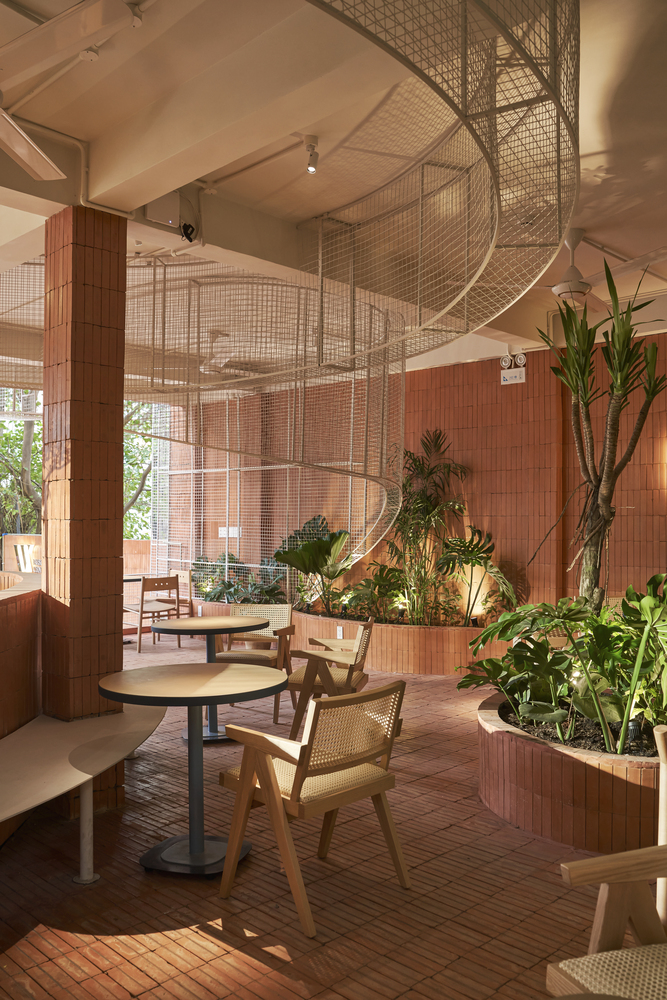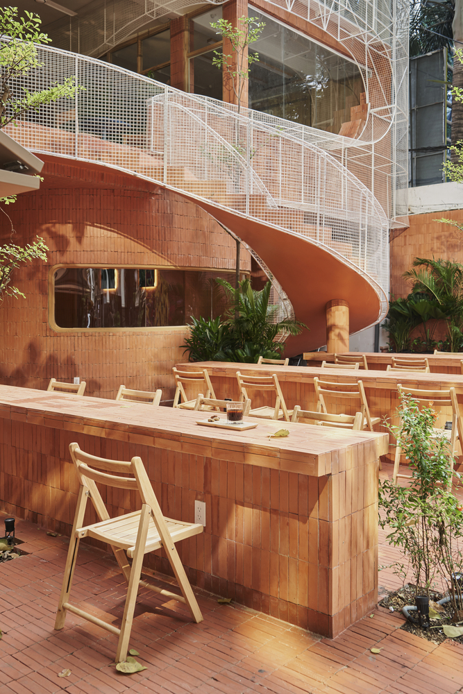 Sự dẫn dắt của những đường cong từ dải bàn chung lớn ở tầng trệt đến khối lưới sắt chạy xuyên suốt công trình, kết hợp cùng những khối gạch đất nung đỏ thẳng thớm, tất cả hòa quyện vào nhau tạo nên một khung cảnh phiêu bồng.