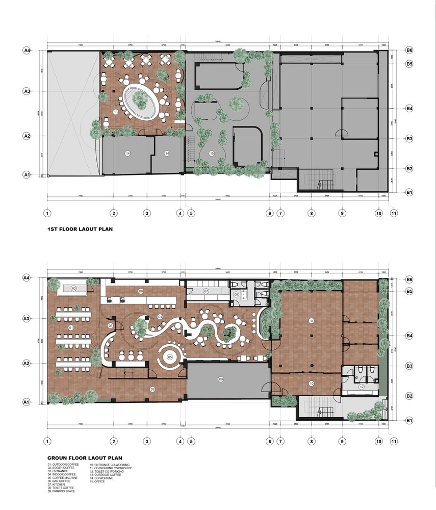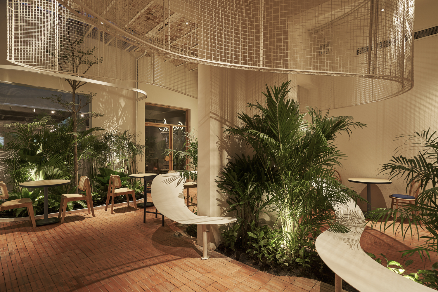 Với một hiện trạng có khá nhiều cột bởi bản thân công trình đã được cải tạo từ khối nhà cũ, do đó nhóm thiết kế đã quyết định kết nối hệ cột này bằng một dải bàn chung lớn trải dài cả không gian tầng 1. Bên cạnh đó tạo ra một lối đi khác bên ngoài công trình dẫn dắt khách từ không gian nội thất tầng 1 lên một “khu vườn nhỏ ngoại thất” tầng 2. Việc tạo ra khoảng thông tầng nhỏ giữa 2 tầng để trồng cây cũng tạo sự kết nối đồng thời lấy sáng cho không gian bên dưới. Với lợi thế công trình lùi sâu và có nhiều cây cối mát mẻ, không gian này phù hợp cho những bạn yêu thích không khí tự nhiên.