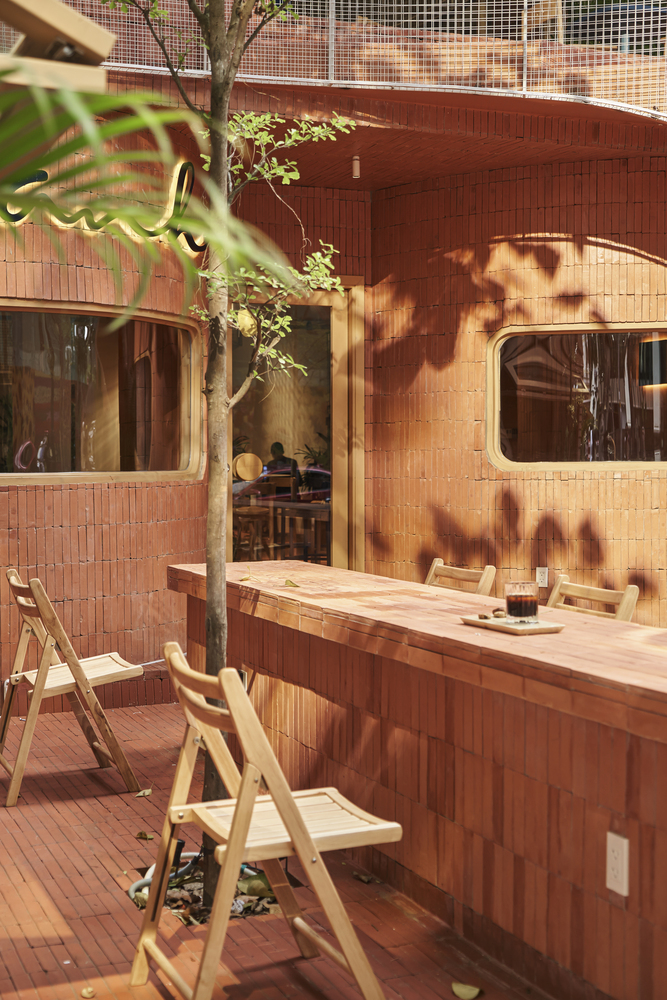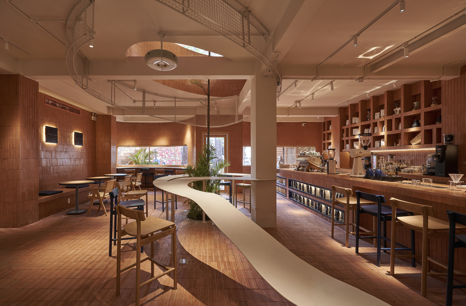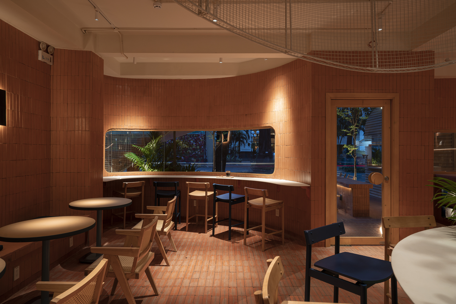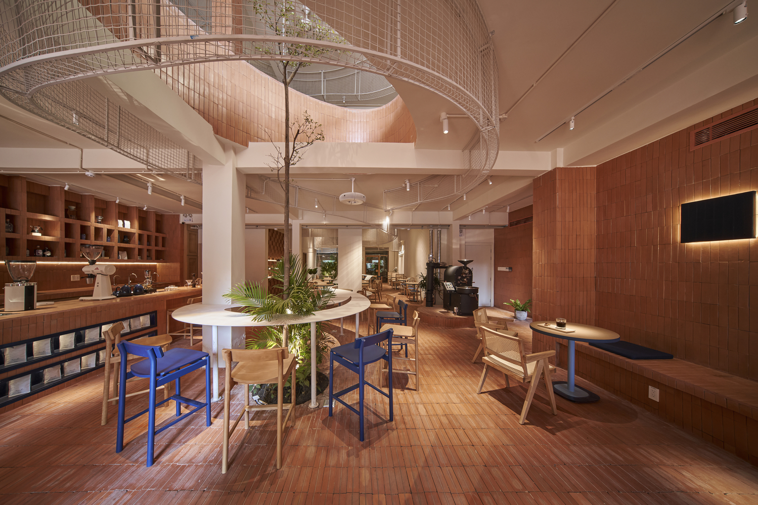 Bằng ngôn ngữ thiết kế và sự kết hợp vật liệu, Red5studio đem chất liệu gạch đất nung đỏ từ mặt tiền vào toàn bộ không gian nội thất – sàn, tường, quầy bar hay cả những khối ghế ngồi. Phần mây được thể hiện bằng hệ khung lưới sắt chạy dài trên trần xuyên suốt cả 2 tầng và mặt tiền. Ngoài ra màu xanh navy – màu sắc đặc trưng của thương hiệu và gỗ màu tự nhiên cũng được nhóm thiết kế khéo léo đưa vào không gian.
