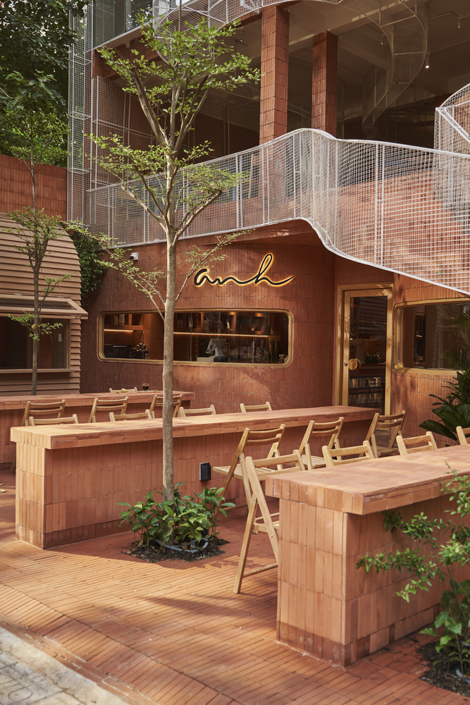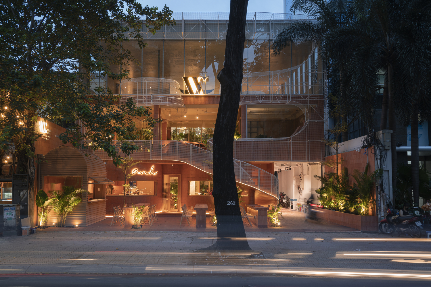 Bằng cách tạo nên một khối nhà “đỏ gạch” cùng với những đường cong nhẹ nhàng của hệ lưới trắng, khó để biết rằng hiện trạng chỉ là một khối văn phòng bằng kính cứng nhắc. Chính sự thay đổi ấn tượng từ màu sắc, hình khối cũng như vật liệu ấy có lẽ đã tạo nên điểm nhấn cho Anh Coffee Roastery chỉ từ ánh nhìn đầu tiên.