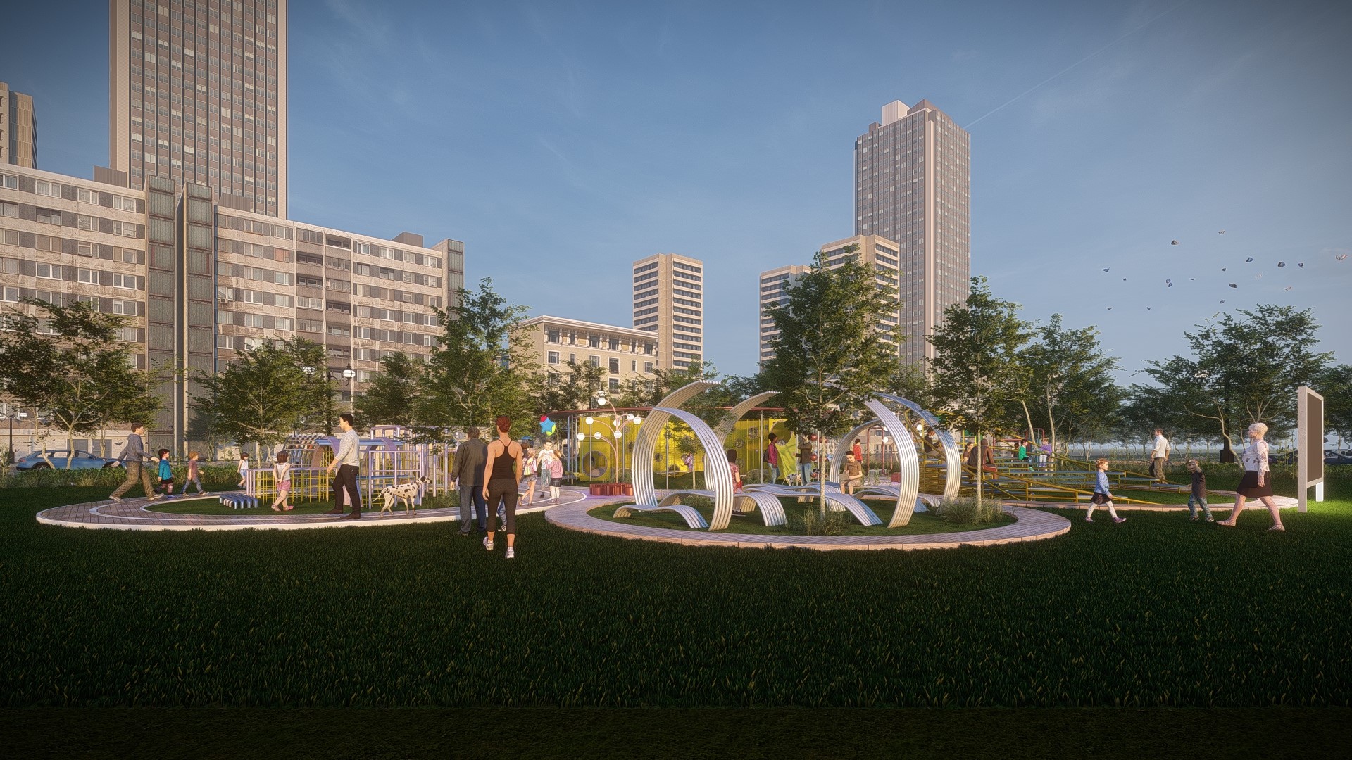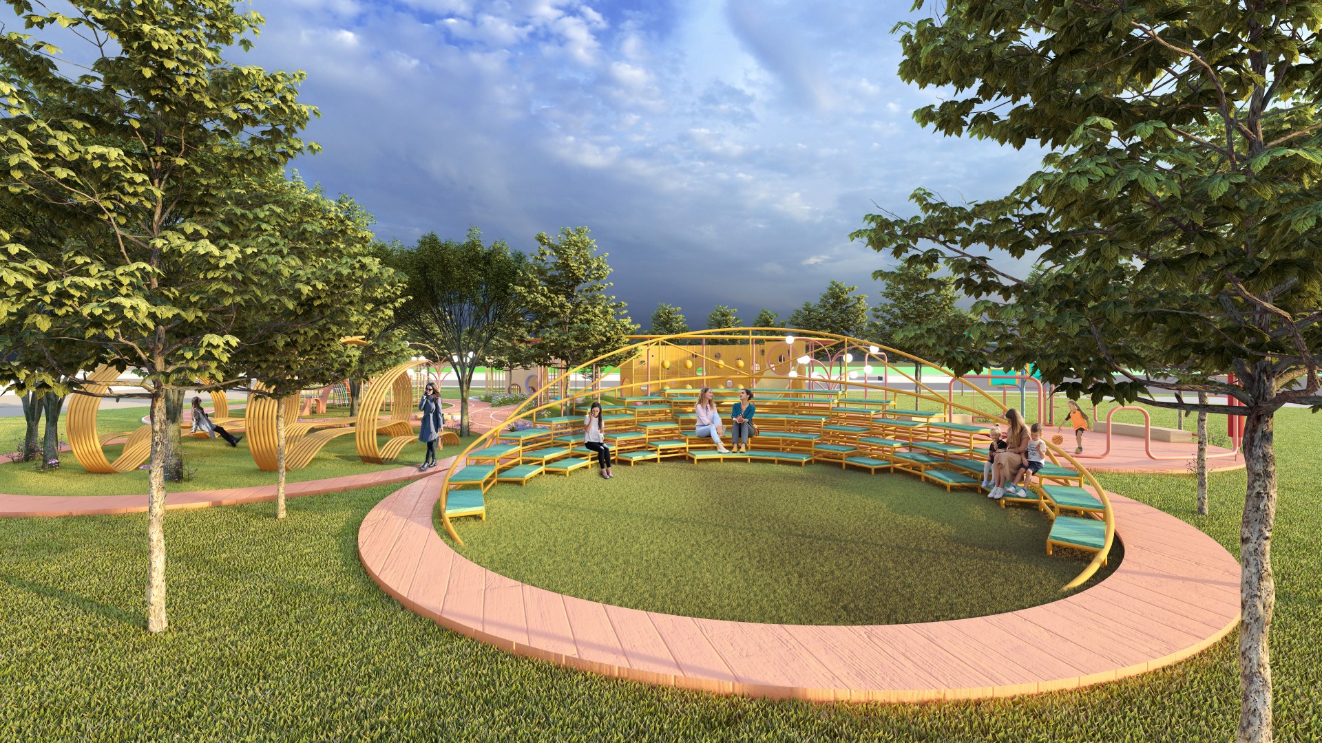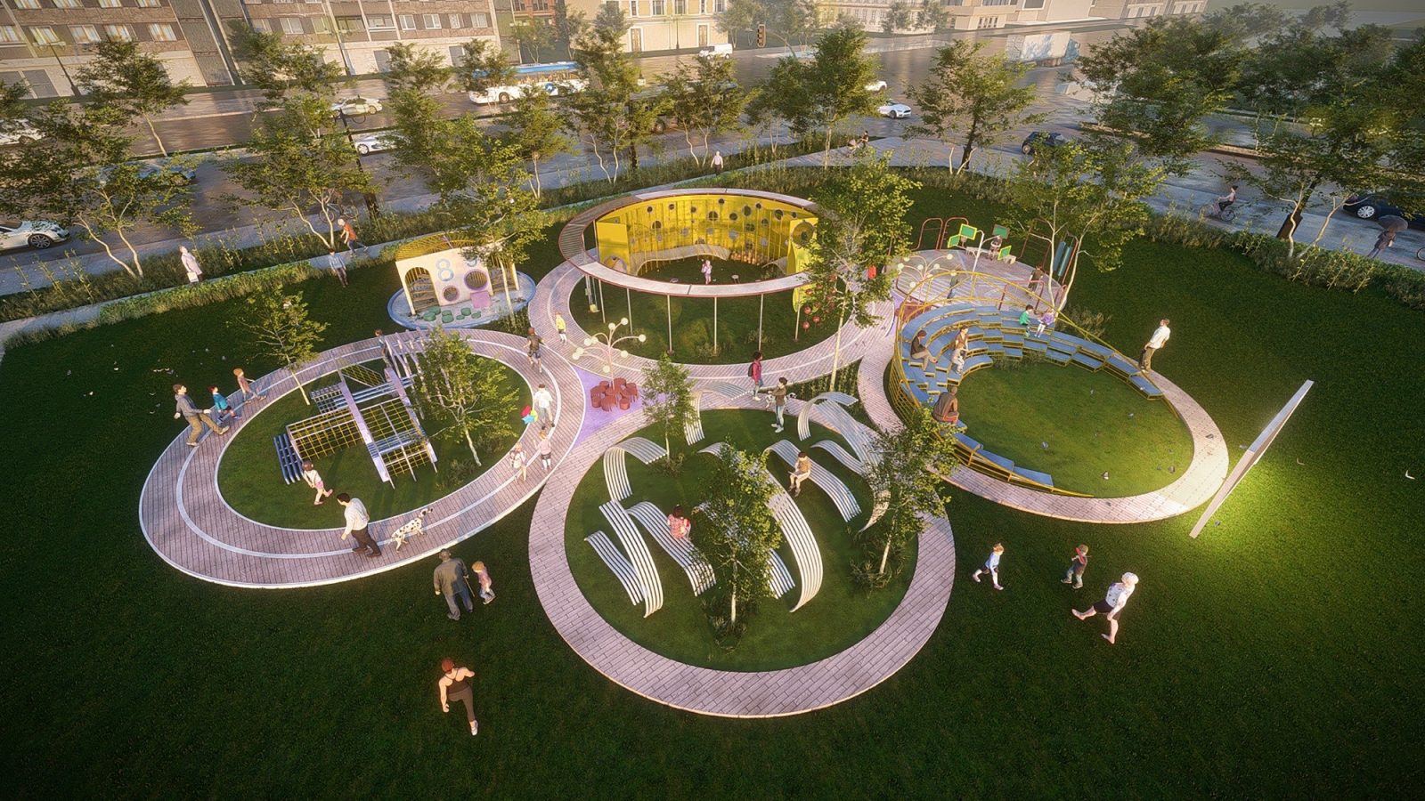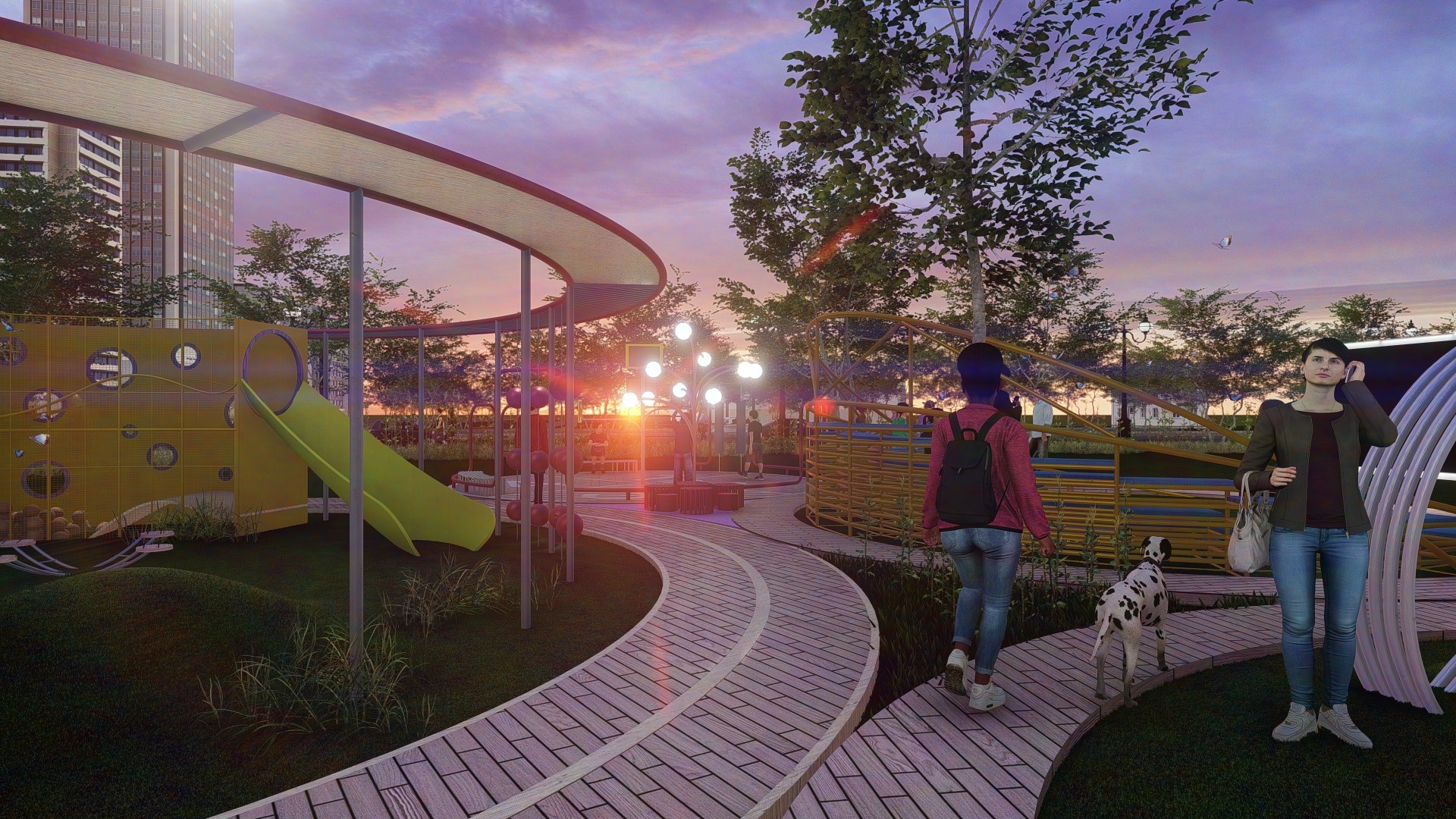 • Đồng thời bố trí cột đèn chùm nhiều bóng giúp làm sáng lối đi và khu vui chơi vào ban đêm.