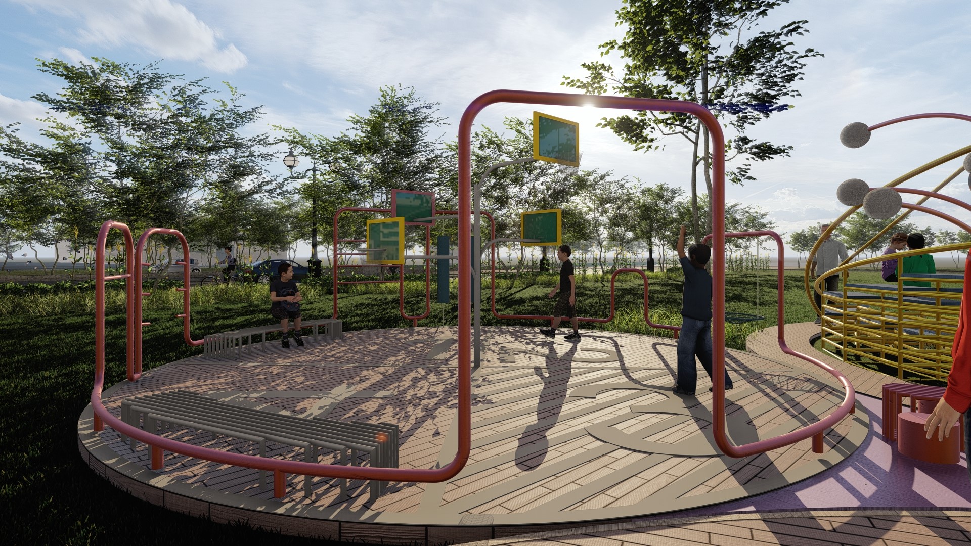 • Ngoài chơi bóng rỗ bên cạnh đó còn bố trí các trò chơi như xích đu, leo trèo, đu xà đơn,..