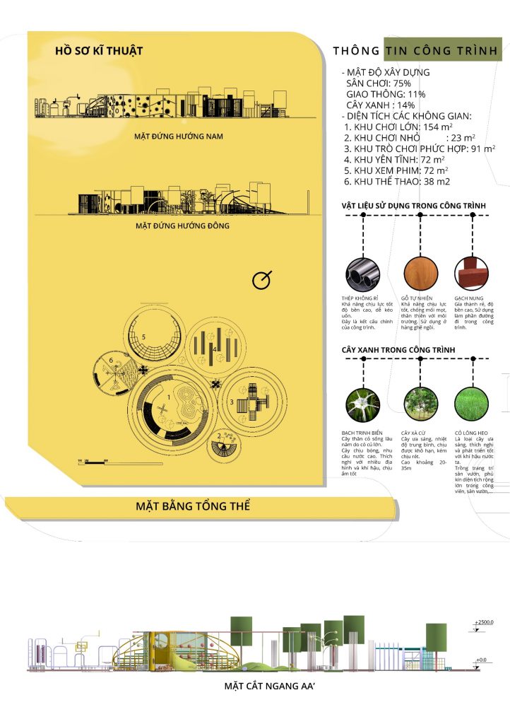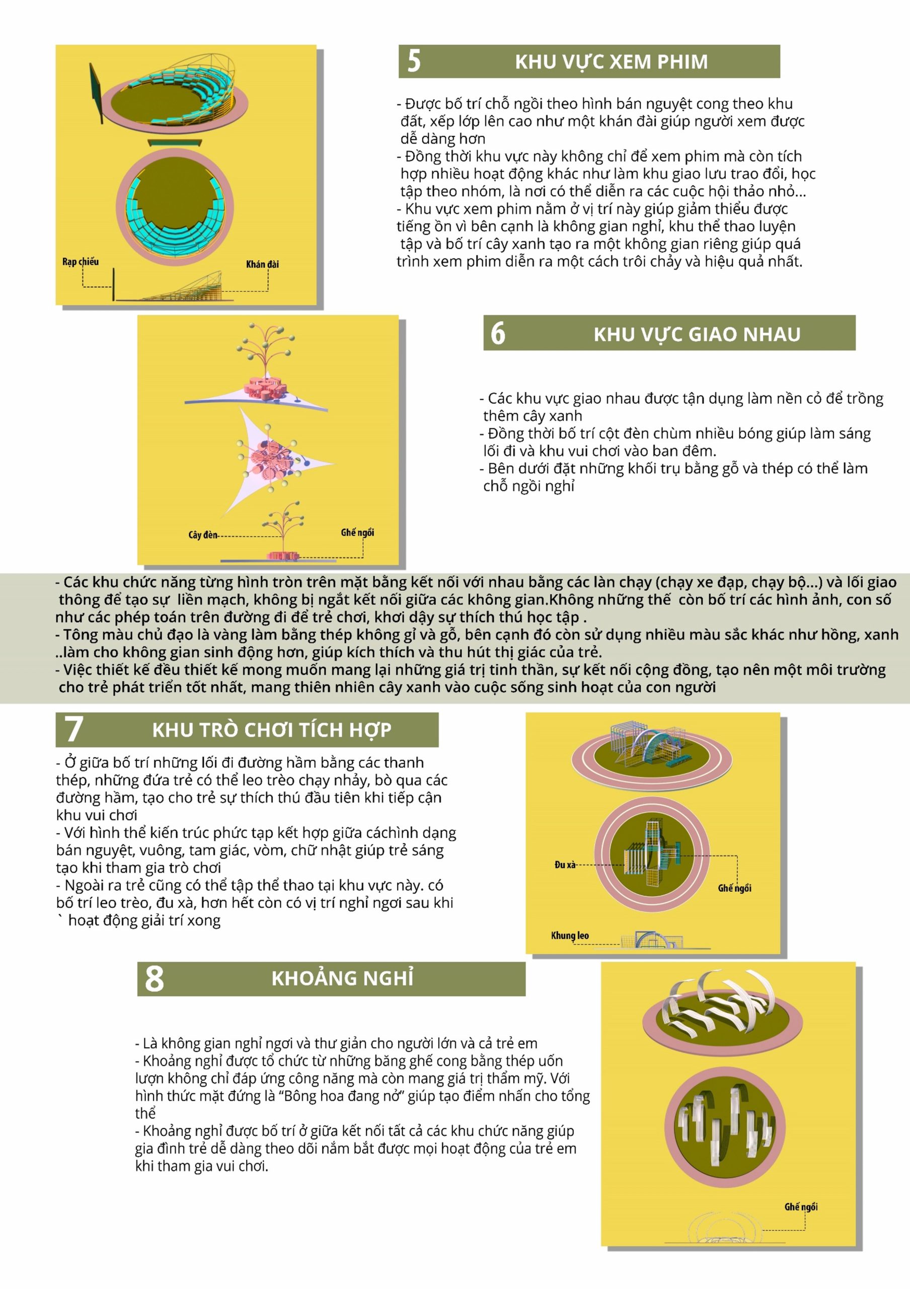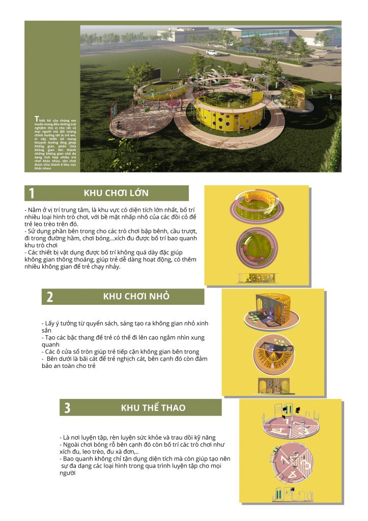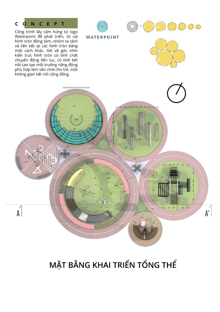Với mong muốn thiết kế một không gian sân chơi để kết nối cộng đồng với nhau, nhóm chúng em đã cùng nhau phát triển để đưa ra phướng án thiết kế cuối cùng của nhóm. Chúng em xây dựng phương án dựa trên logo Waterpoint cách điệu hình học cơ bản mà ở đây là hình tròn, chúng em tổ hợp các hình tròn đa dạng kích cỡ đảm nhận nhiều chức năng khác nhau được liên kết bằng các lối giao thông liền mạch kết nối mọi không gian. Hình tròn đại diện cho sự hoàn hảo, liền mạch, không kết thúc cũng giống như những mối quan hệ cộng động sẽ ngày càng gắng khít. Phần công năng chúng em luôn đề cao việc đáp ứng tối đa nhu cầu vui chơi cho đối tượng chính mà BTC hướng tới là trẻ em, bên cạnh đó còn bố trí thêm một số không gian mà cả người lớn có thể tham gia như xem phim, chơi bóng rổ, đạp xe, không gian nghỉ… cây xanh cũng được lồng ghép vào tất cả các không gian tạo nên sự hài hòa giữa con người và thiên nhiên. Để phù hợp với tiêu chí dễ lắp ghép không tác động quá nhiều đến nền móng, nhóm cho rằng sử dụng vật liệu ống thép làm chủ đạo là phù hợp với yêu cầu thiết kế. Kèm theo đó nhóm còn cố gắng lồng ghép sử dụng các vật liệu như gỗ, gạch,… phần gạch được lót ở dưới, phía trên là gỗ để làm đường chạy, các vật liệu này ko cần phải xin giấy phép, dễ tháo lắp, độ bền tốt khi tháo ra vẫn có thể tái sử dụng.