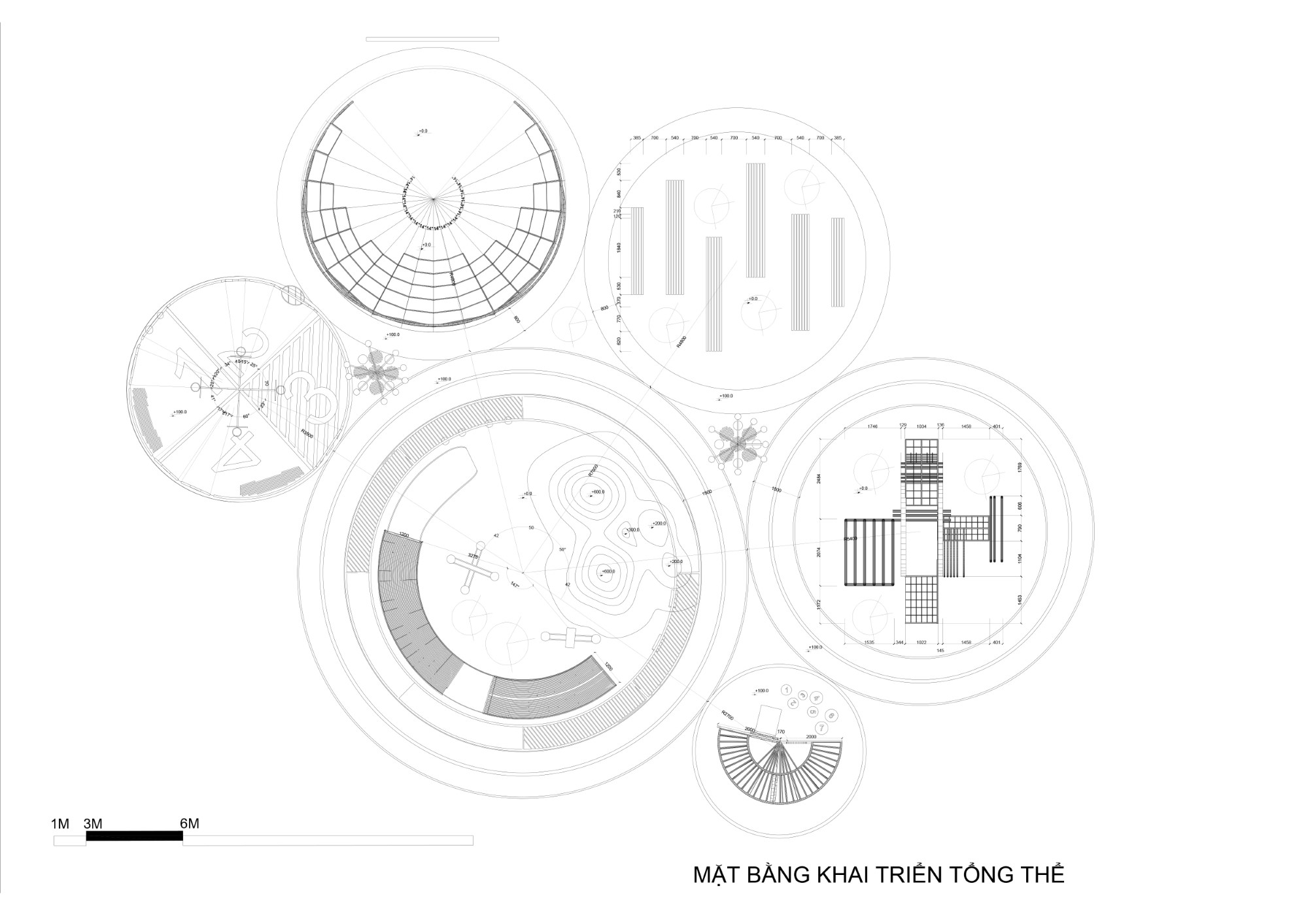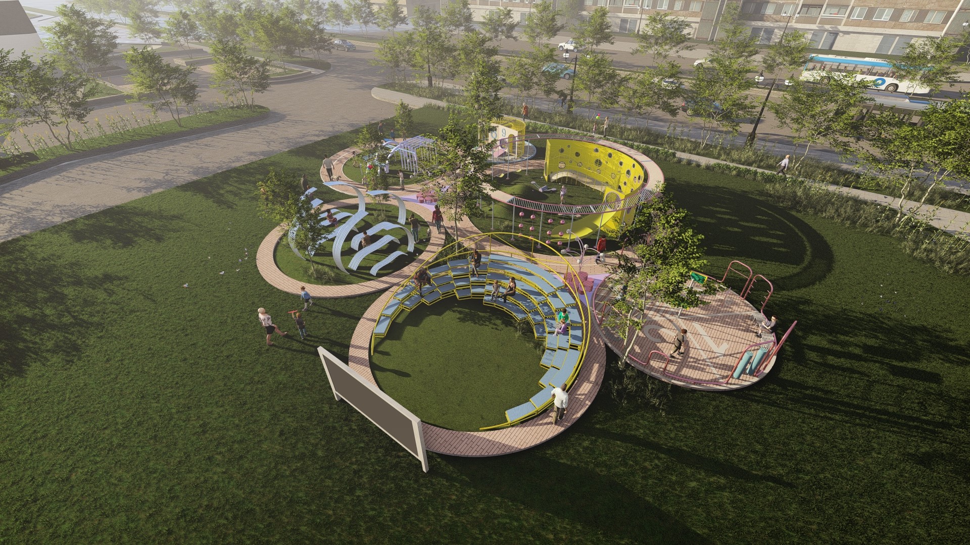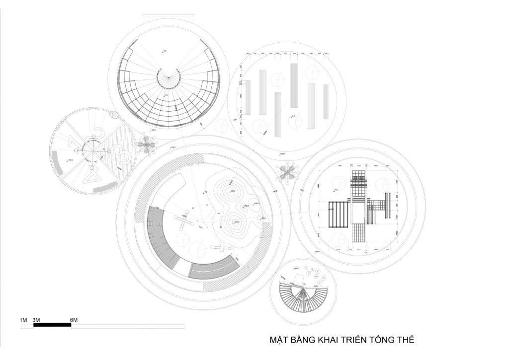 Với mong muốn thiết kế một không gian sân chơi để kết nối cộng đồng với nhau, nhóm chúng em đã cùng nhau phát triển để đưa ra phướng án thiết kế cuối cùng của nhóm. Chúng em xây dựng phương án dựa trên logo Waterpoint cách điệu hình học cơ bản mà ở đây là hình tròn, chúng em tổ hợp các hình tròn đa dạng kích cỡ đảm nhận nhiều chức năng khác nhau được liên kết bằng các lối giao thông liền mạch kết nối mọi không gian. Hình tròn đại diện cho sự hoàn hảo, liền mạch, không kết thúc cũng giống như những mối quan hệ cộng động sẽ ngày càng gắng khít. Phần công năng chúng em luôn đề cao việc đáp ứng tối đa nhu cầu vui chơi cho đối tượng chính mà BTC hướng tới là trẻ em, bên cạnh đó còn bố trí thêm một số không gian mà cả người lớn có thể tham gia như xem phim, chơi bóng rổ, đạp xe, không gian nghỉ… cây xanh cũng được lồng ghép vào tất cả các không gian tạo nên sự hài hòa giữa con người và thiên nhiên. Để phù hợp với tiêu chí dễ lắp ghép không tác động quá nhiều đến nền móng, nhóm cho rằng sử dụng vật liệu ống thép làm chủ đạo là phù hợp với yêu cầu thiết kế. Kèm theo đó nhóm còn cố gắng lồng ghép sử dụng các vật liệu như gỗ, gạch,… phần gạch được lót ở dưới, phía trên là gỗ để làm đường chạy, các vật liệu này ko cần phải xin giấy phép, dễ tháo lắp, độ bền tốt khi tháo ra vẫn có thể tái sử dụng.