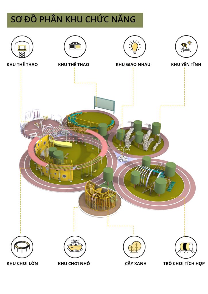 • Khoảng nghỉ được bố trí ở giữa kết nối tất cả các khu chức năng giúp gia đình trẻ dễ dàng theo dõi nắm bắt được mọi hoạt động của trẻ em khi tham gia vui chơi.