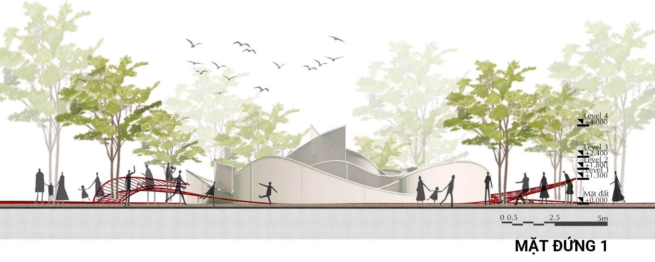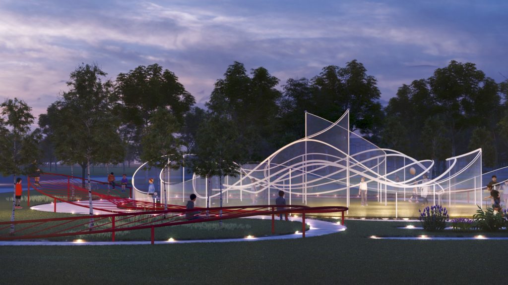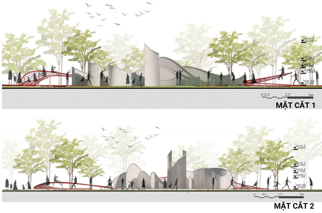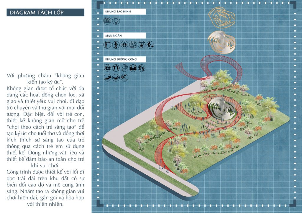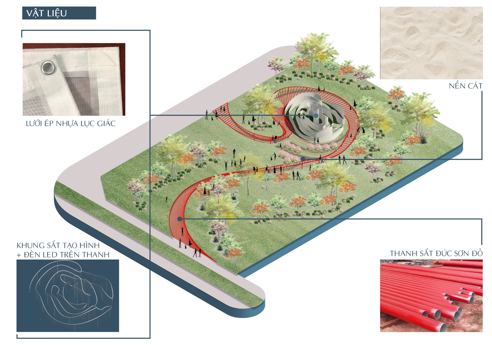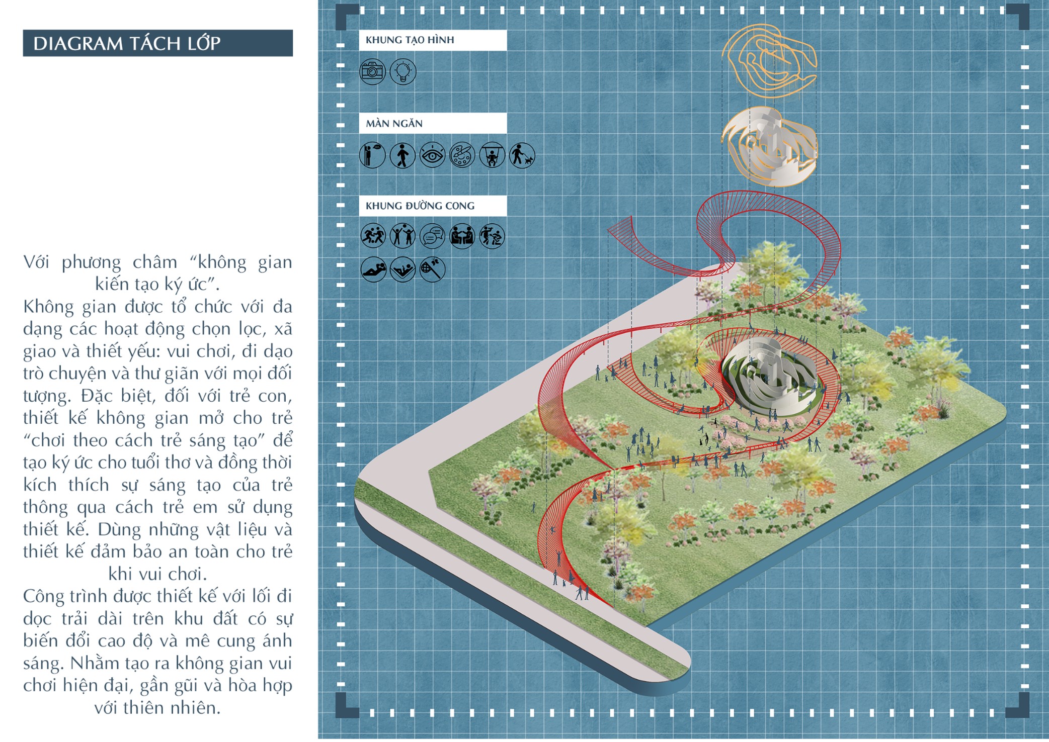 Công trình được thiết kế với lối đi trải dài trên khu đất có sự biến đổi cao độ, được lót nền cát và mê cung ánh sáng. Nhằm tạo ra không gian vui chơi hiện đại, gần gũi và hòa hợp với thiên nhiên.