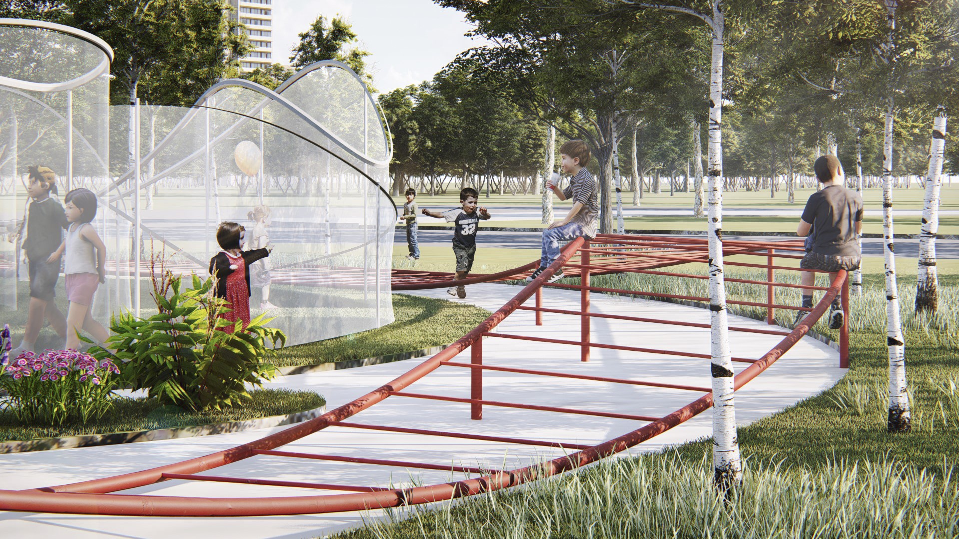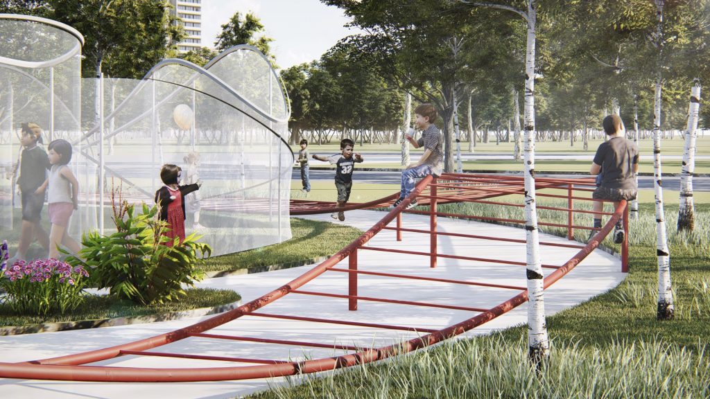 Không gian được tổ chức với đa dạng các hoạt động chọn lọc, xã hội và thiết yếu: vui chơi, đi dạo, trò chuyện và thư giản với mọi đối tượng. Đặc biệt, đối với trẻ con, thiết kế không gian mở cho trẻ ”chơi theo cách trẻ sáng tạo” để tạo ký ức cho tuổi thơ và đồng thời kích thích sự sáng tạo của trẻ thông qua cách trẻ em sử dụng thiết kế. Dùng những vật liệu và thiết kế đảm bảo an toàn cho trẻ khi vui chơi.