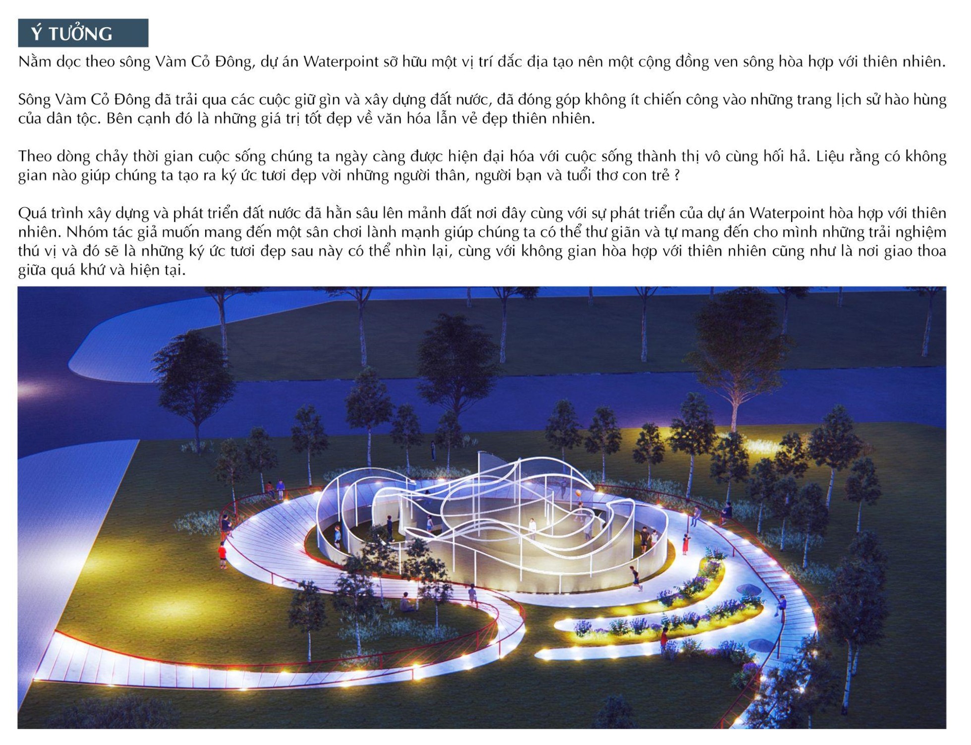 Quá trình xây dựng và phát triển đất nước đã hằn sâu lên mảnh đất nơi đây cùng với sự phát triển của dự án Waterpoint hòa hợp với thiên nhiên. Nhóm tác giả muốn mang đến một sân chơi lành mạnh giúp chúng ta có thể thư giãn và tự mang đến cho mình những trải nghiệm thú vị và đó sẽ là những ký ức tươi đẹp sau này có thể nhìn lại, cùng với không gian hòa hợp với thiên nhiên cũng như là nơi giao thoa giữa quá khứ và hiện tại.