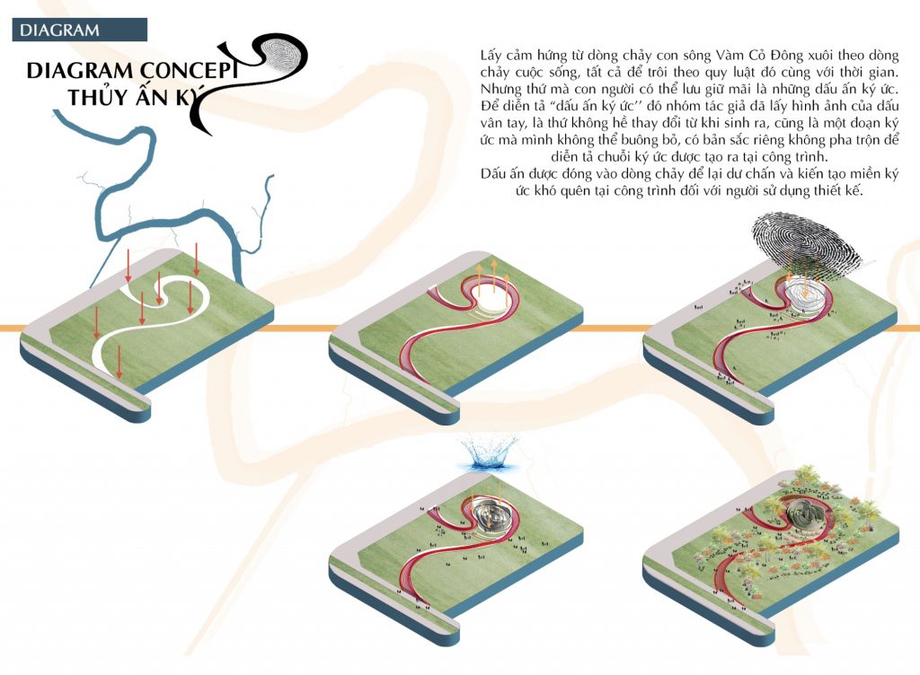 Lấy cảm hứng từ dòng chảy con sông Vàm Cỏ Đông xuôi theo dòng chảy cuộc sống, tất cả đều trôi theo quy luật đó cùng với thời gian. Nhưng thứ mà con người có thể lưu giữ mãi là những dấu ấn ký ức. Để diễn tả “dấu ấn ký ức” đó nhóm tác giả đã lấy hình ảnh của dấu vân tay, là thứ không hề thay đổi từ khi sinh ra đến mãi về sau, cũng là một đoạn ký ức mà mỗi người trong chúng ta không thể buông bỏ, có bản sắc riêng và không bị pha trộn, để diễn tả chuỗi ký ức được tạo ra tại công trình. Dấu ấn được đóng vào dòng chảy và để lại dư chấn, kiến tạo miền ký ức khó quên được lưu giữ tại công trình đối với người sử dụng thiết kế.