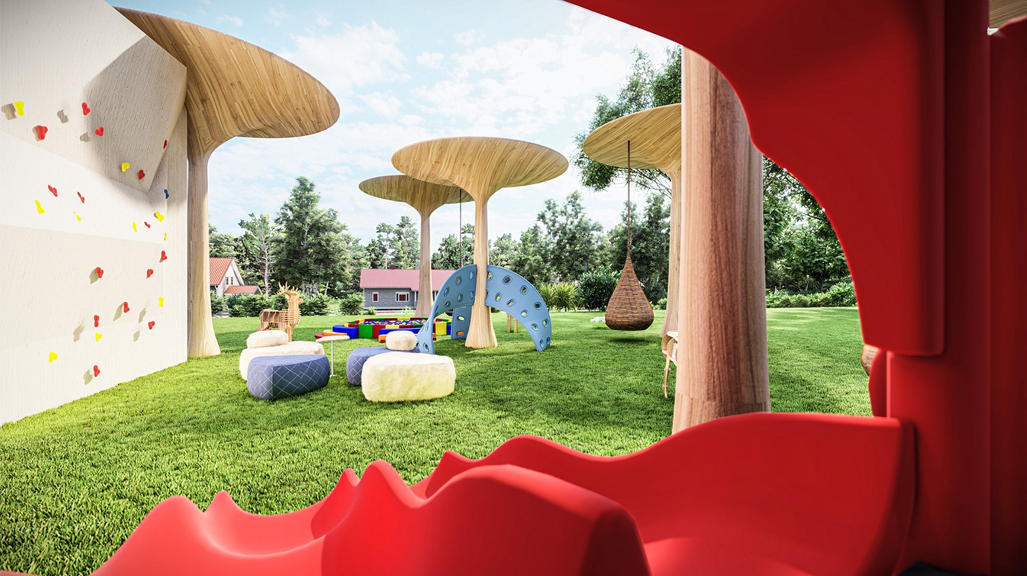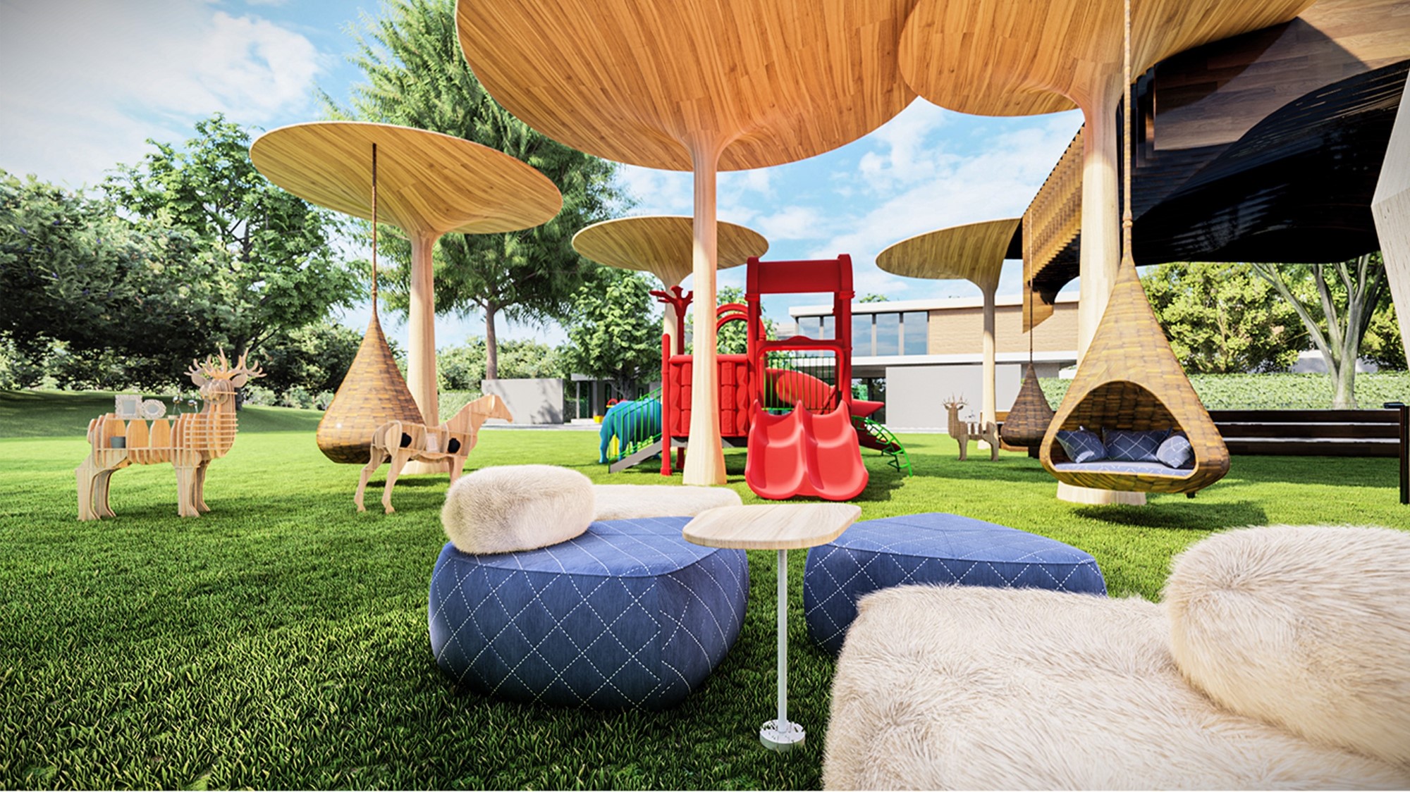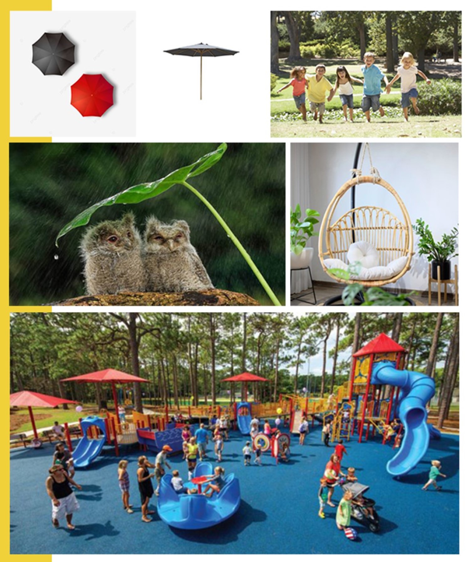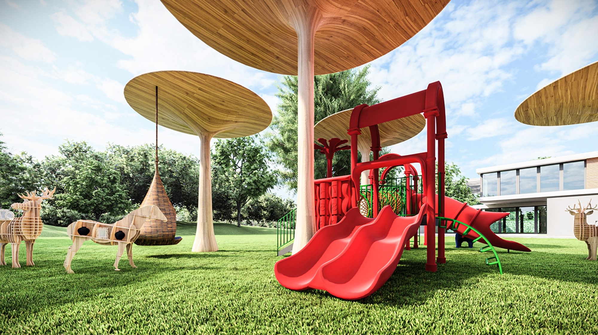 Nhìn từ trực diện trên cao, một loạt các cột gỗ tròn vành vạnh gợi liên tưởng đến những chiếc Ô bung xòe. Xích đu mô phỏng hình dạng giọt nước lấy tán Ô làm điểm tựa, hệt như đang e ấp “trú mưa”