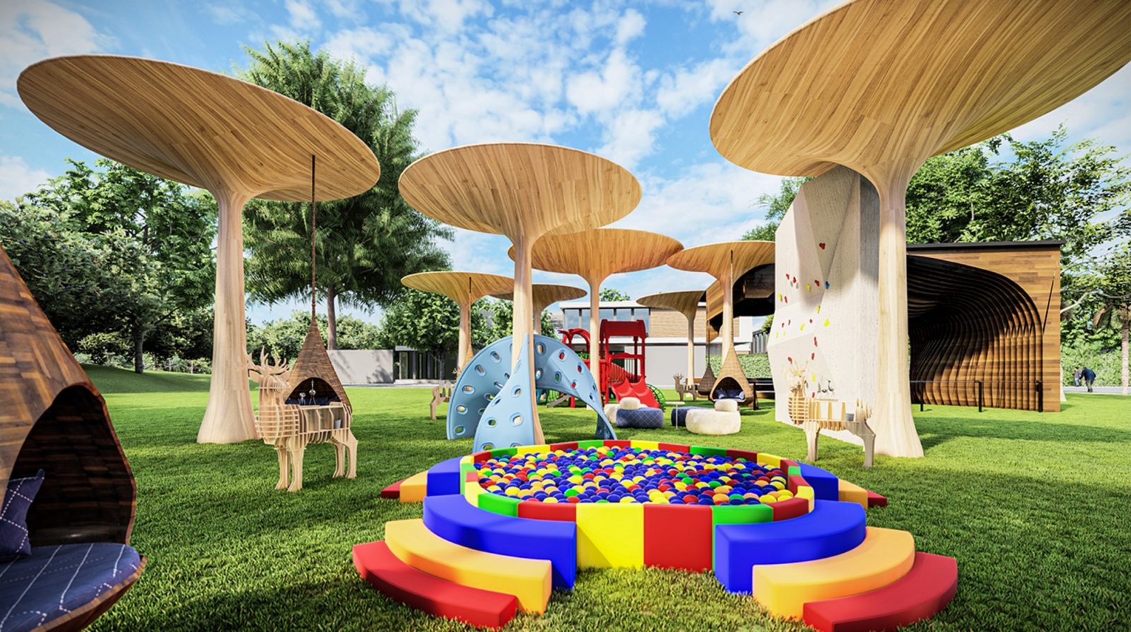 Những tán Ô lớn tạo bóng râm cho không gian, bảo vệ trẻ em khỏi những ngày nắng nóng.