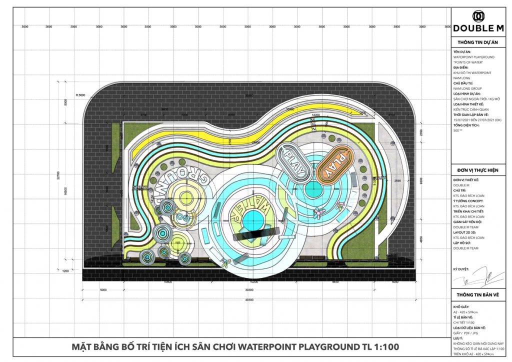 Ý tưởng thiết kế sân Playground “Points of Water” dành riêng cho Waterpoints Nam Long được Double M cùng tác giả tôn vinh và phát triển và từ chính chiếc logo thân thuộc của khu đô thị Waterpoint, một biểu tượng Iconic đồ họa tượng trưng cho sóng nước. “Points of Water” chính là sự gắn kết giao thoa giữa các sóng nước Water ring, mô phỏng hình ảnh sông nước và cũng là chủ đề luôn song hành của khu đô thị Waterpoints.