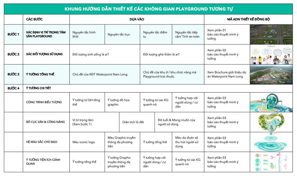 Có 4 nguyên tắc về mặt không gian đã được ứng dụng nhằm xác định được vị trí chính xác của sân Playground, đáp ứng mục tiêu và thoả mãn yêu cầu của đề thi, cũng như tôn vinh những giá trị sẵn có của Quy hoạch tổng thể tại Khu đô thị Waterpoint Nam Long.