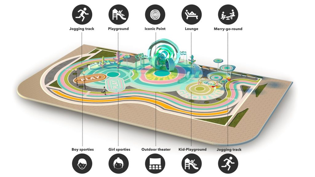 - Công trình biểu tượng tại trung tâm sân Playground giúp việc định hướng và thu hút ánh nhìn của cư dân ngay từ xa, những đối tượng sử dụng tuyến Bus Interchange và đặc biệt là tương tác ngay với sự tò mò và hiếu kỳ của trẻ nhỏ.