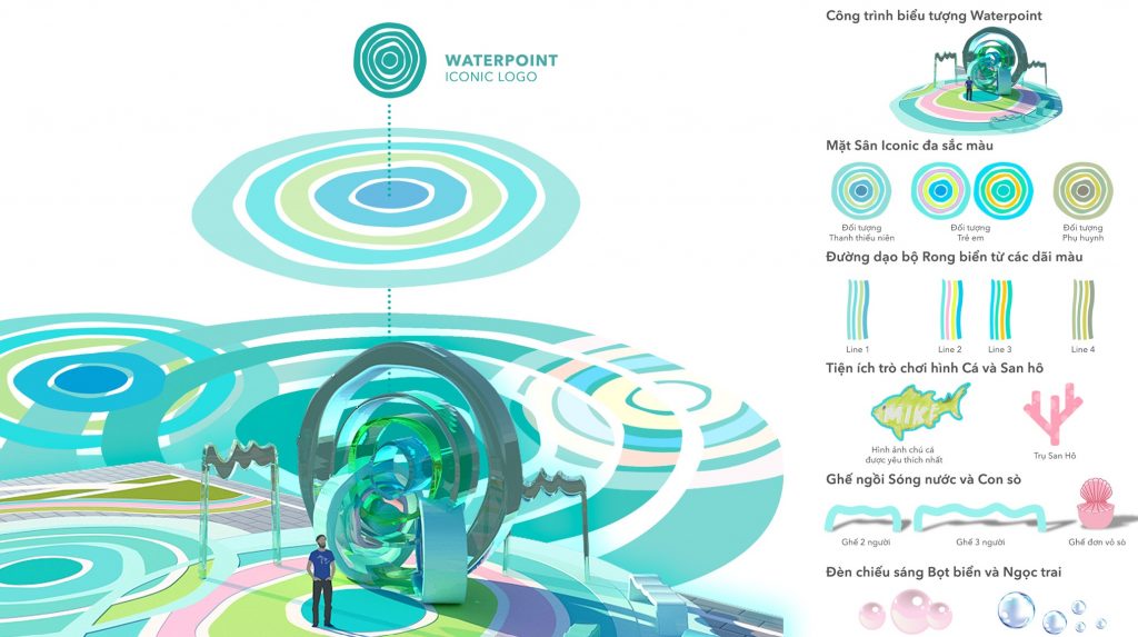 - Biểu tượng “Points of Water” không chỉ làm nổi bật không gian sân chơi mà còn gắn liền với quá trình quảng bá marketing cho Dự án Waterpoint khi Biểu tượng Iconic được hiển thị rõ ràng ngay tại không gian công cộng dưới dạng quảng trường.