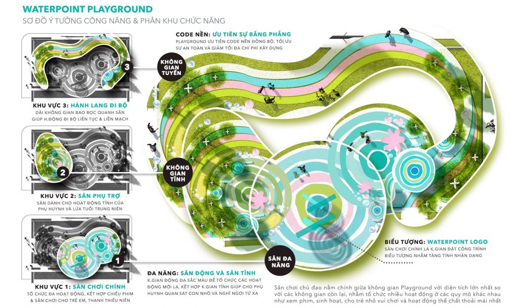 Phân chia không gian chính phụ / chức năng và tổ chức hoạt động sân Playground dựa vào ý tưởng sóng nước đồng tâm “Points of Water” trên mặt nước