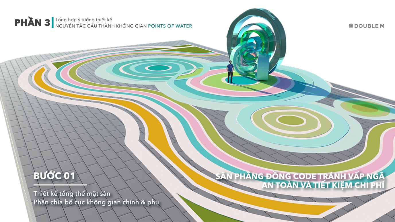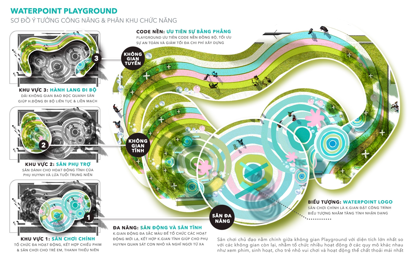 Phân chia không gian chính phụ / chức năng và tổ chức hoạt động sân Playground dựa vào ý tưởng sóng nước đồng tâm “Points of Water” trên mặt nước