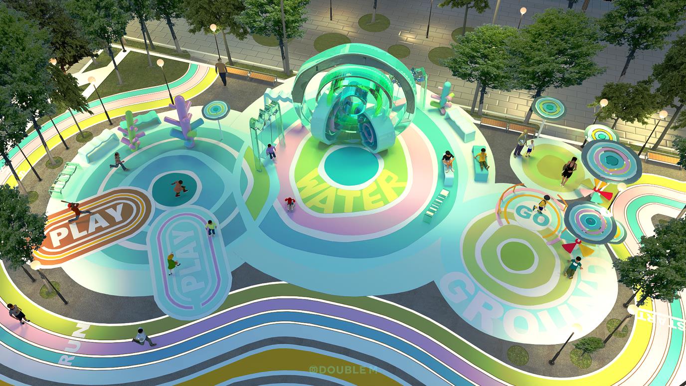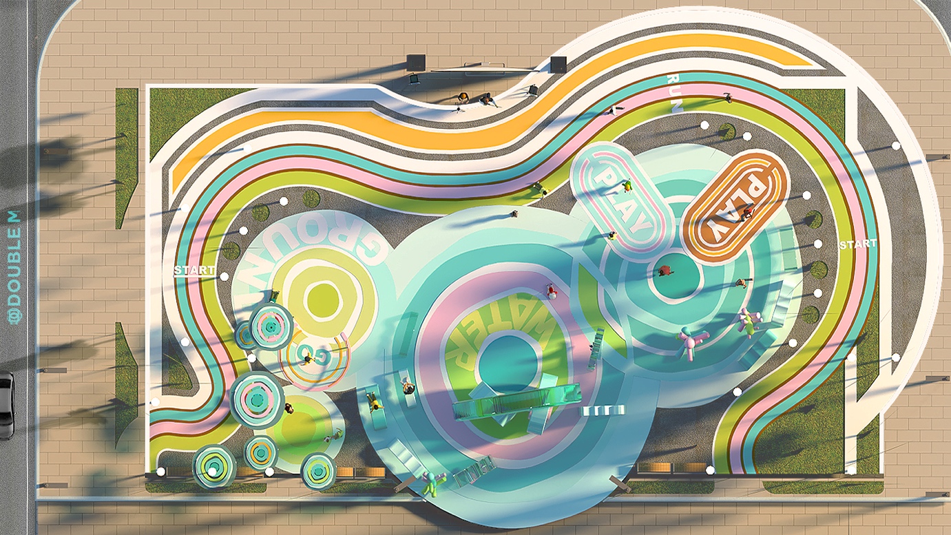 Ý tưởng thiết kế sân Playground “Points of Water” dành riêng cho Waterpoints Nam Long được Double M cùng tác giả tôn vinh và phát triển và từ chính chiếc logo thân thuộc của khu đô thị Waterpoint, một biểu tượng Iconic đồ họa tượng trưng cho sóng nước.