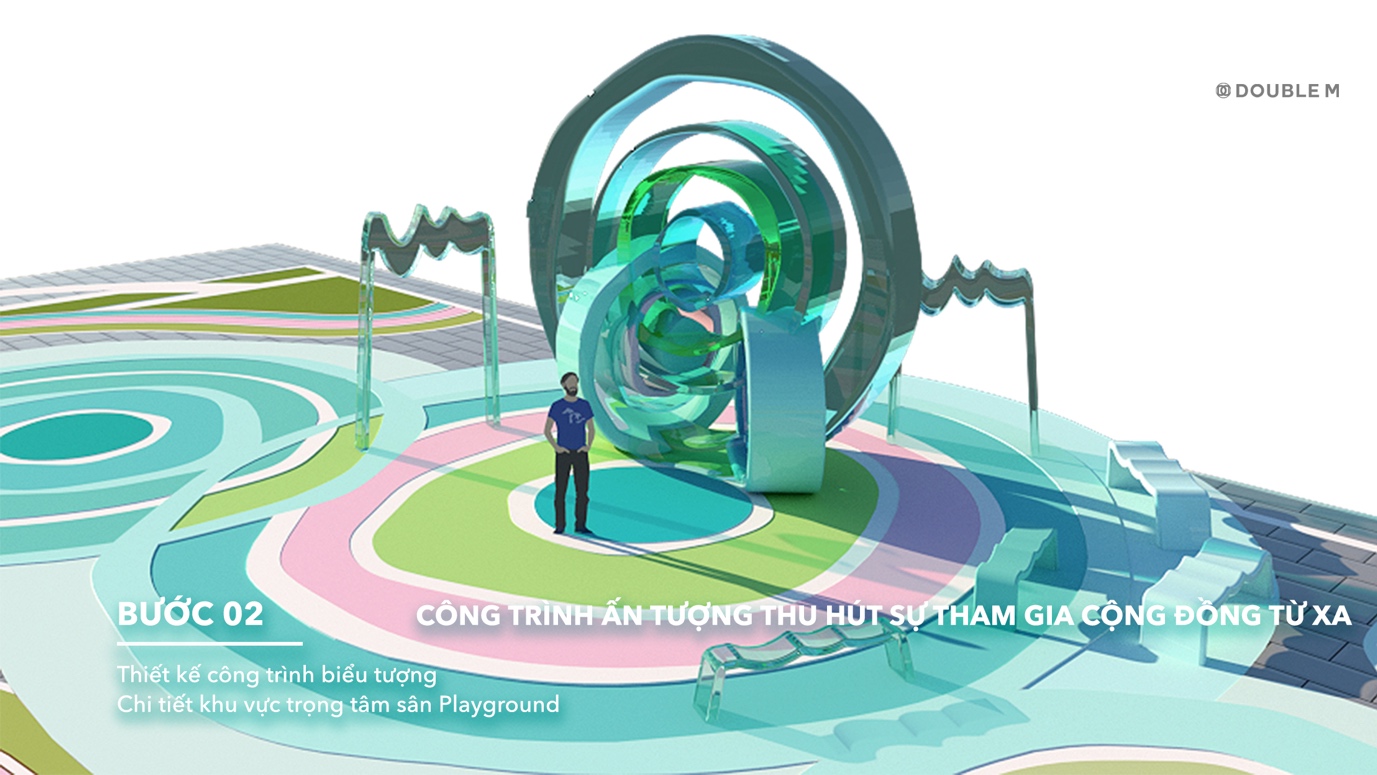 - Công trình biểu tượng tại trung tâm sân Playground giúp việc định hướng và thu hút ánh nhìn của cư dân ngay từ xa, những đối tượng sử dụng tuyến Bus Interchange và đặc biệt là tương tác ngay với sự tò mò và hiếu kỳ của trẻ nhỏ.