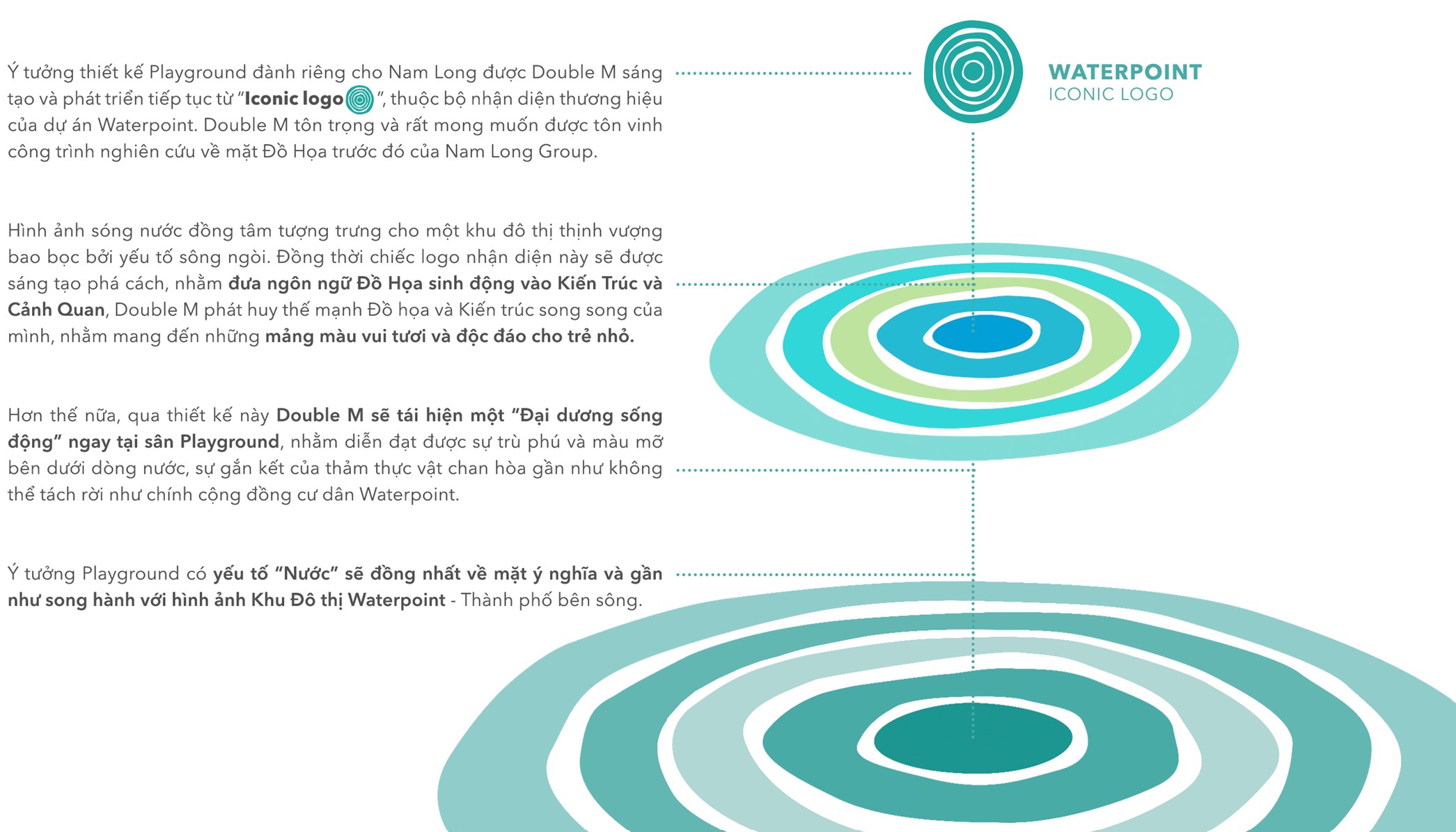 Ý tưởng thiết kế Playground dành riêng cho Nam Long được Double M sáng tạo và phát triển tiếp tục từ “Iconic logo”, thuộc bộ nhận diện thương hiệu của dự án Waterpoint. Double M tôn trọng và rất mong muốn được tôn vinh công trình nghiên cứu về mặt Đồ Họa trước đó của Nam Long Group.
