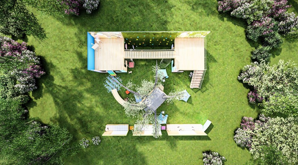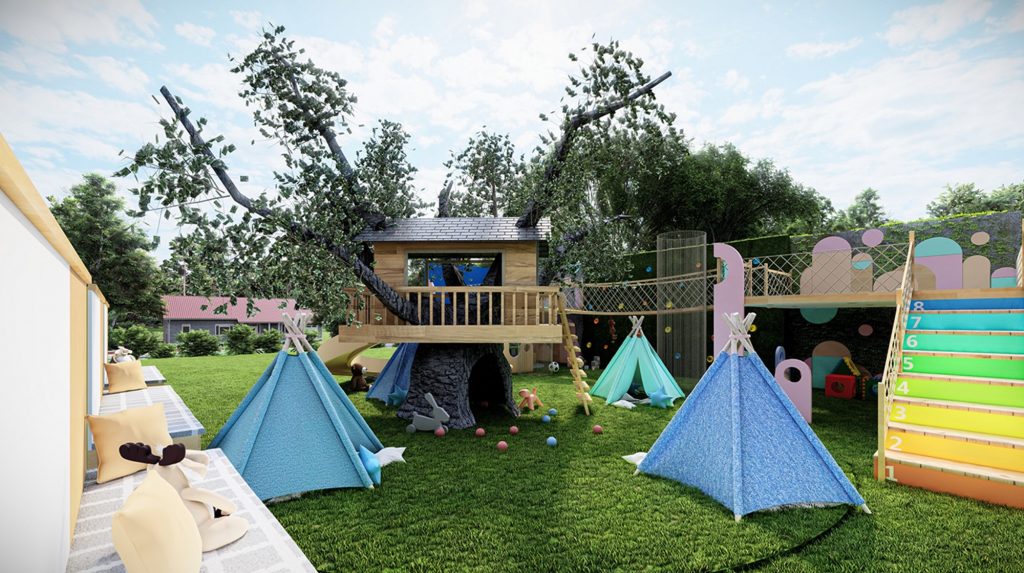 Nhà banh cùng khu vực bàn ghế kết nối với nhau qua một chiếc cầu, tạo nên một “tòa nhà” hình chữ H. Trọng tâm của không gian là ngôi nhà gỗ với thiết kế đơn giản, xinh xắn. Khi đứng từ bên trong, tầm mắt của trẻ có thể bao quát toàn bộ cảnh quan, thuận tiện hơn trong việc học hỏi về thiên nhiên và thế giới xung quanh. Cùng với đó là những chiếc lều gỗ hình tam giác với kết cấu đơn giản, gợi cảm giác như một buổi cắm trại.
