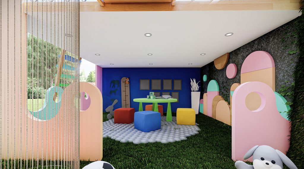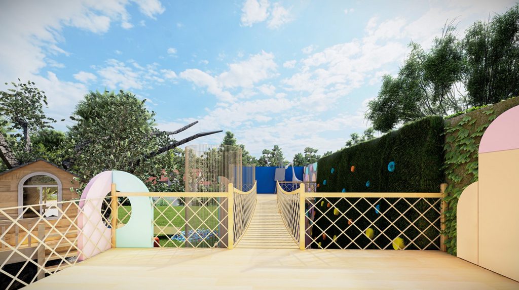 Bằng cách sử dụng các tông màu pastel, nhóm thiết kế đã điểm xuyết cho không gian một nét dịu dàng, không quá đơn điệu nhưng vẫn toát lên sự tinh tế. Nổi bật là các bậc thang màu neon và những chiếc ghế đơn sắc, đối lập hoàn toàn với sự nền nã của tổng thể sân chơi như một biển báo giúp trẻ em chú ý cẩn thận khi vận động.