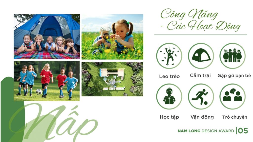 Đời sống tinh thần của con người ngày càng phát triển, nhu cầu về các không gian sân chơi (playground) cũng theo đó được chú trọng hơn. Nấp được xây dựng trên tinh thần khơi dậy sự tìm tòi, ưa thích khám phá của trẻ em, đồng thời gợi lại những kí ức tuổi thơ với lều trại, nhà gỗ. Đây không chỉ là nơi vui chơi, rèn luyện, học hỏi, mà còn là “trái tim” gắn kết cộng đồng dân cư.