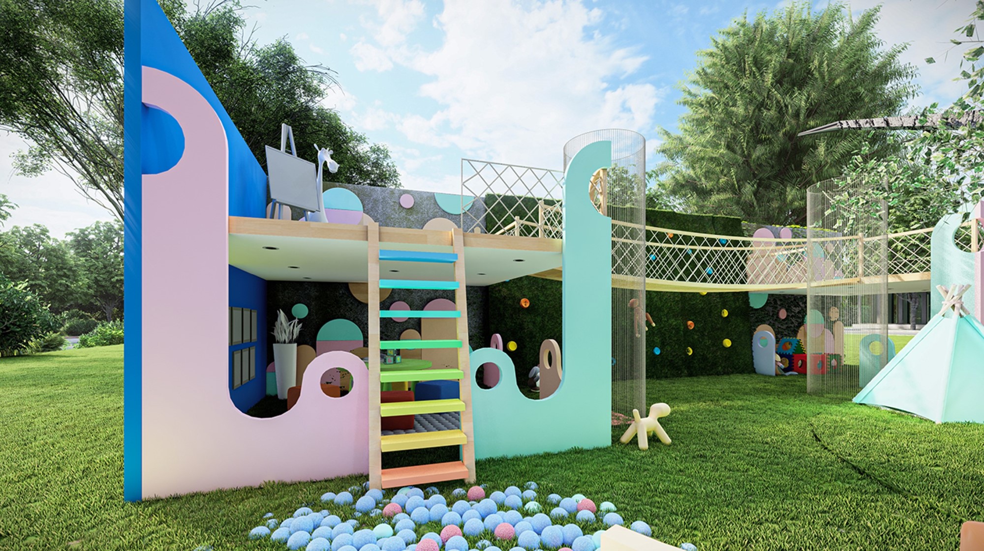 Bằng cách sử dụng các tông màu pastel, nhóm thiết kế đã điểm xuyết cho không gian một nét dịu dàng, không quá đơn điệu nhưng vẫn toát lên sự tinh tế. Nổi bật là các bậc thang màu neon và những chiếc ghế đơn sắc, đối lập hoàn toàn với sự nền nã của tổng thể sân chơi như một biển báo giúp trẻ em chú ý cẩn thận khi vận động.