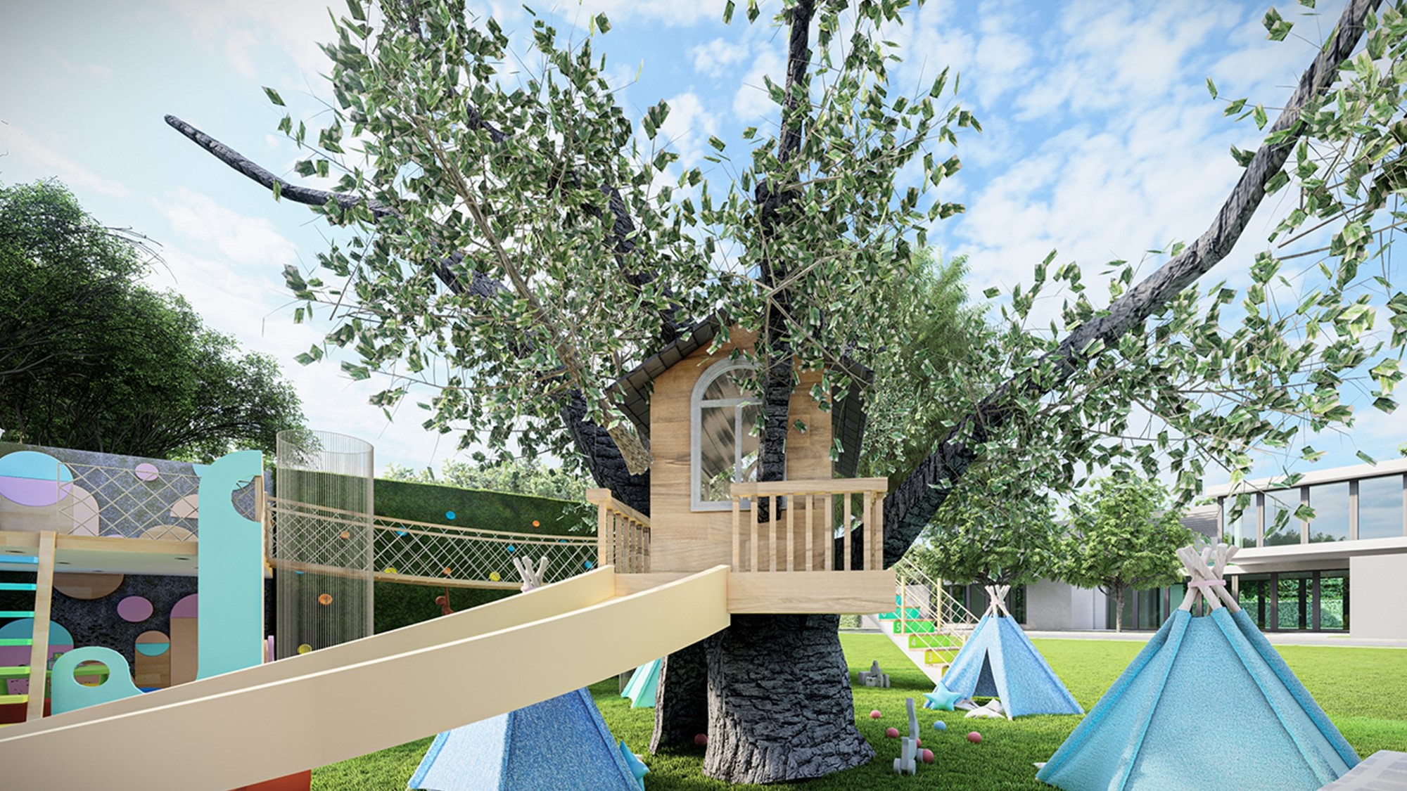 Nhà banh cùng khu vực bàn ghế kết nối với nhau qua một chiếc cầu, tạo nên một “tòa nhà” hình chữ H. Trọng tâm của không gian là ngôi nhà gỗ với thiết kế đơn giản, xinh xắn. Khi đứng từ bên trong, tầm mắt của trẻ có thể bao quát toàn bộ cảnh quan, thuận tiện hơn trong việc học hỏi về thiên nhiên và thế giới xung quanh. Cùng với đó là những chiếc lều gỗ hình tam giác với kết cấu đơn giản, gợi cảm giác như một buổi cắm trại.