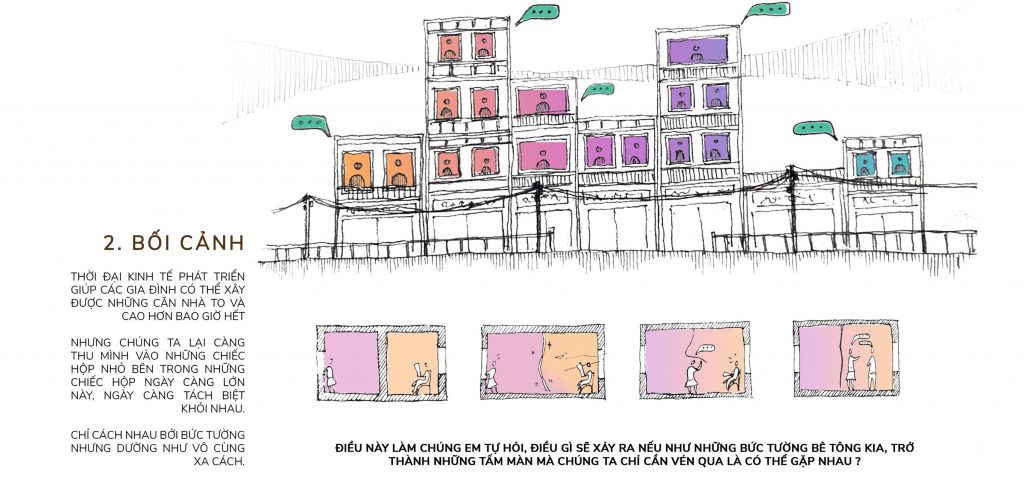 Thời đại kinh tế – kĩ thuật phát triển vượt bậc như hiện nay, điều dễ thấy các gia đình có thể sở hữu những căn nhà to và cao hơn bao giờ hết. Nhưng về cơ bản của vấn đề, phải chăng chúng ta đang càng ngày càng thu mình vào trong những chiếc hộp, ngày càng tách biệt nhau? Chỉ vọn vẹn 1, 2 bức tường nhưng dường như vô cùng xa cách. Điều làm chúng em tự hỏi, điều gì sẽ xảy ra nếu những bức tường bê tông kia, trở thành những tấm màn mà chúng ta có thể vén qua là có thể gặp nhau?