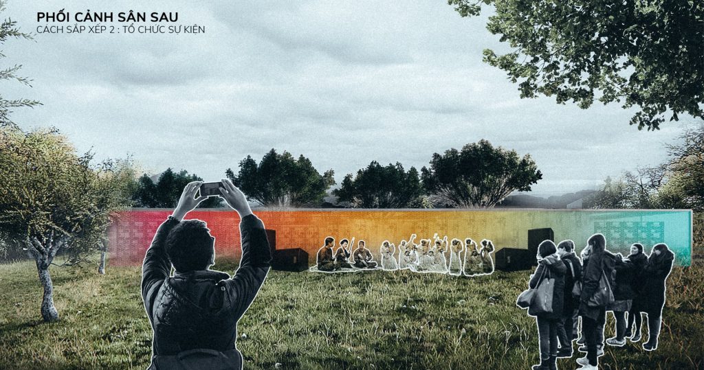 - Cách sắp xếp 2: Các khối hộp có thể trượt xếp thẳng hàng nhau tạo thành một mặt phẳng ở sân sau, có thể khai thác làm nền cho các buổi hòa nhạc, diễn kịch sân khấu, hội nghị, xem phim ngoài trời.