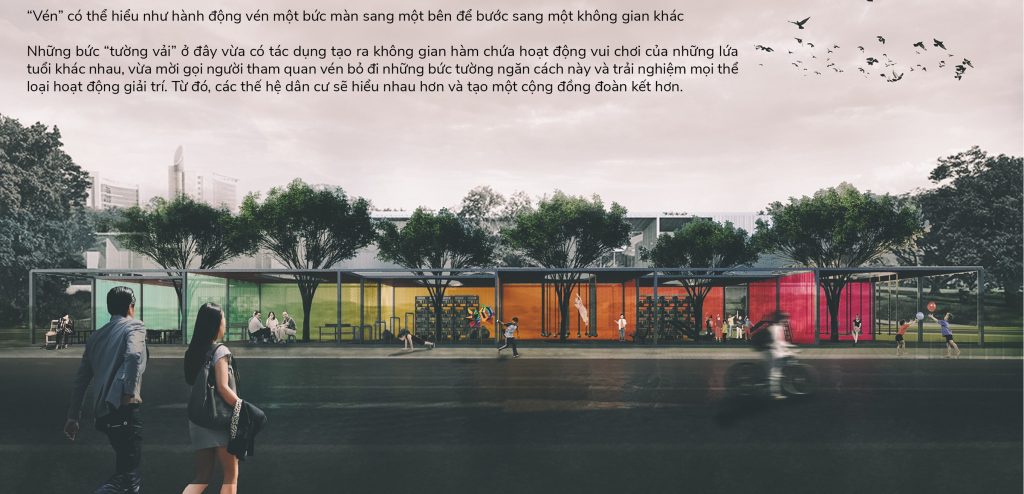 “Vén” có thể hiểu như hành động vén một bức màn sang một bên để bước vào một không gian khác. Những bức “tường vải” ở đây vừa có tác dụng tạo ra không gian hàm chứa hoạt động vui chơi của các lứa tuổi khác nhau, vừa mời gọi người tham quan vén bỏ đi những bức tường ngăn cách này và trải nghiệm mọi thể loại hoạt động giải trí. Từ đó, các thế hệ dân cư sẽ hiểu nhau hơn và tạo một cộng đồng đoàn kết hơn.