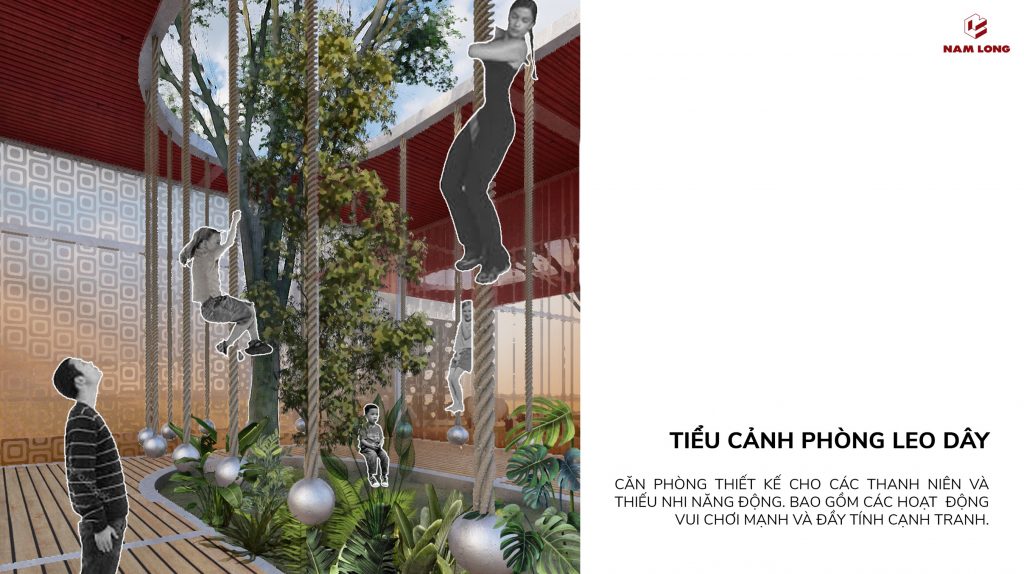 - Phòng leo dây: Thiết kế dành cho thanh thiếu niên, người sử dụng có thể sáng tạo cách sử dụng, như tạo cuộc thi leo dây, đu dây.