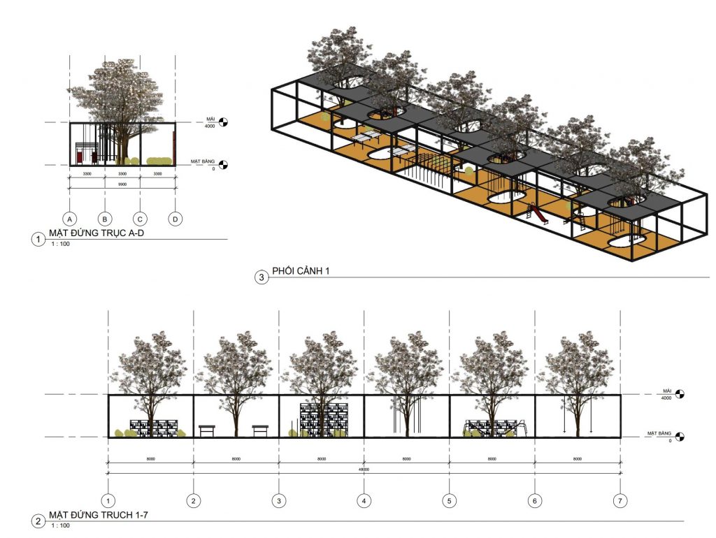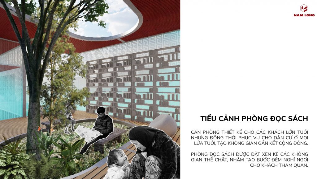 - Phòng đọc sách 1: Thiết kê dành cho trẻ em, sân trước có bố trí các cầu tuột, không gian cần sự giám sát của người lớn.