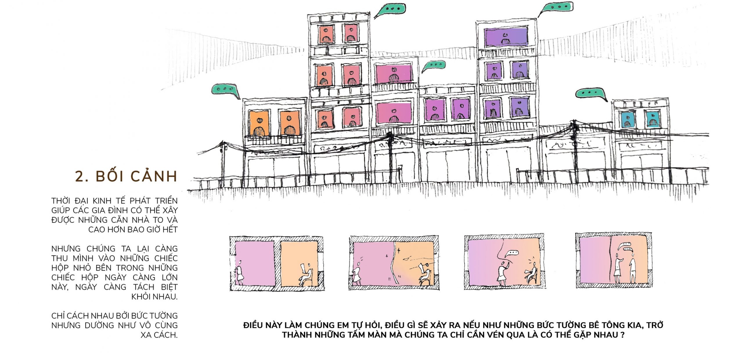 Thời đại kinh tế – kĩ thuật phát triển vượt bậc như hiện nay, điều dễ thấy các gia đình có thể sở hữu những căn nhà to và cao hơn bao giờ hết. Nhưng về cơ bản của vấn đề, phải chăng chúng ta đang càng ngày càng thu mình vào trong những chiếc hộp, ngày càng tách biệt nhau? Chỉ vọn vẹn 1, 2 bức tường nhưng dường như vô cùng xa cách. Điều làm chúng em tự hỏi, điều gì sẽ xảy ra nếu những bức tường bê tông kia, trở thành những tấm màn mà chúng ta có thể vén qua là có thể gặp nhau?