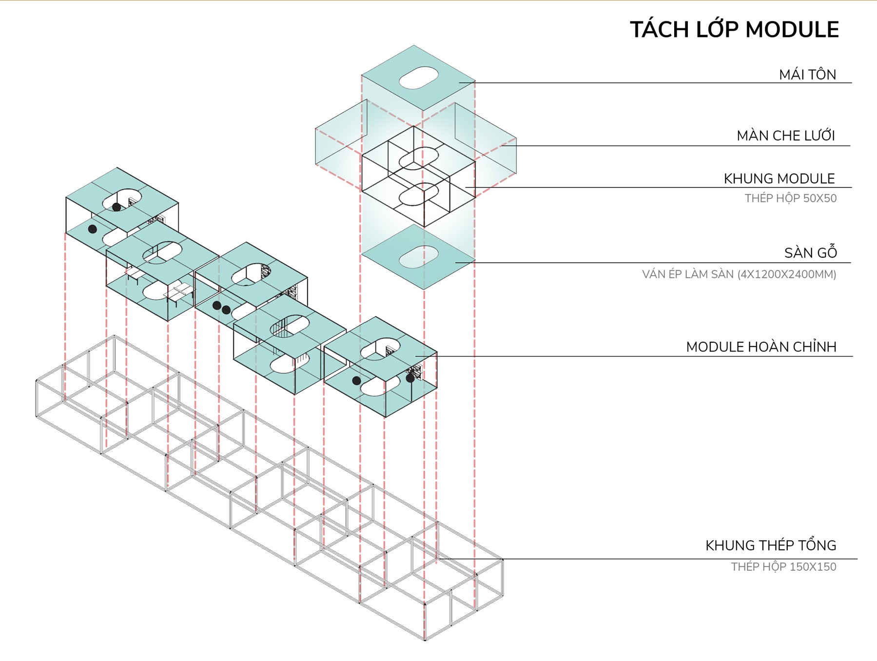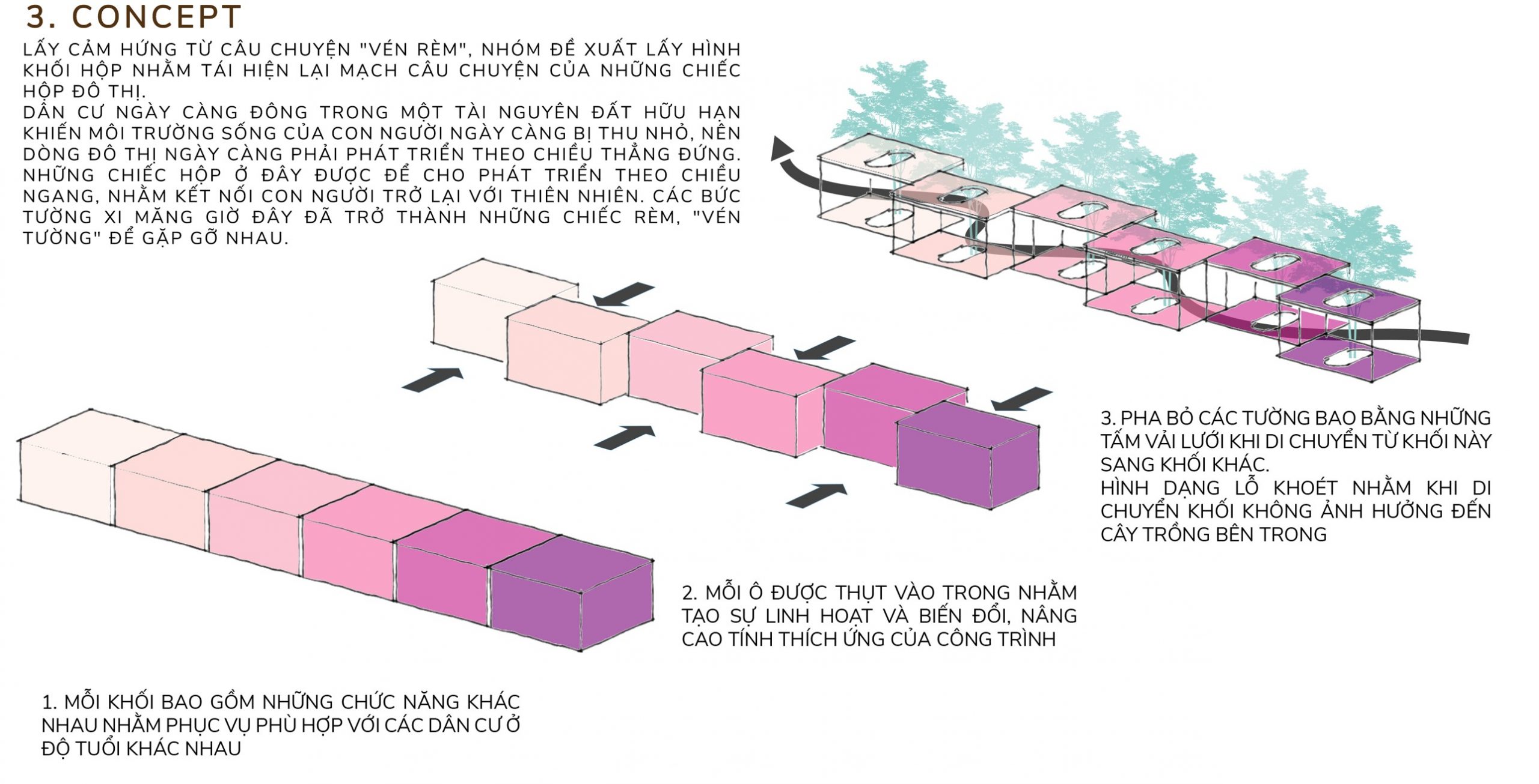 Lấy cảm hứng từ câu chuyện vén rèm. Nhóm đề xuất lấy hình khối hộp nhằm tái hiện lại mạch câu chuyện của những chiếc hộp đô thị. Dân cư ngày càng đông trong một tài nguyên đất hữu hạn. Khiến môi trường sống của con người ngày càng thu nhỏ, nên dòng đô thị ngày càng phải phát triển theo chiều thẳng đứng.