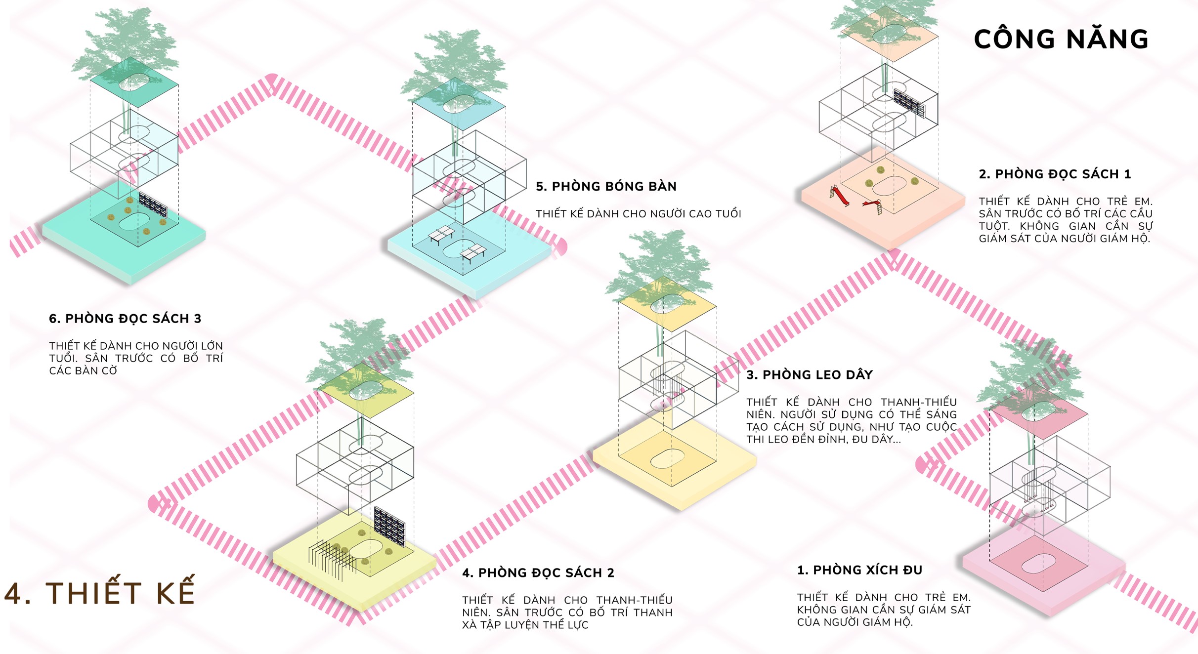 - Phòng leo dây: Thiết kế dành cho thanh thiếu niên, người sử dụng có thể sáng tạo cách sử dụng, như tạo cuộc thi leo dây, đu dây.