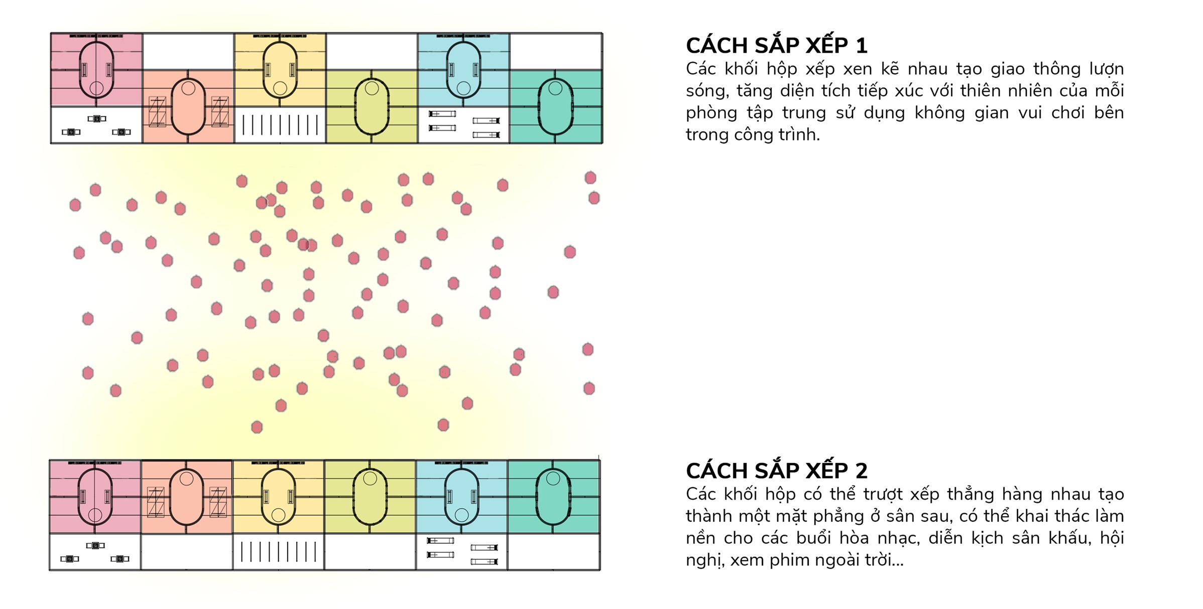 - Cách sắp xếp 1: Các khối hộp xếp xen kẽ nhau tạo giao thông lượn sóng, tăng diện tích tiếp xúc với thiên nhiên của mỗi phòng, tập trung sử dụng không gian vui chơi bên trong công trình.