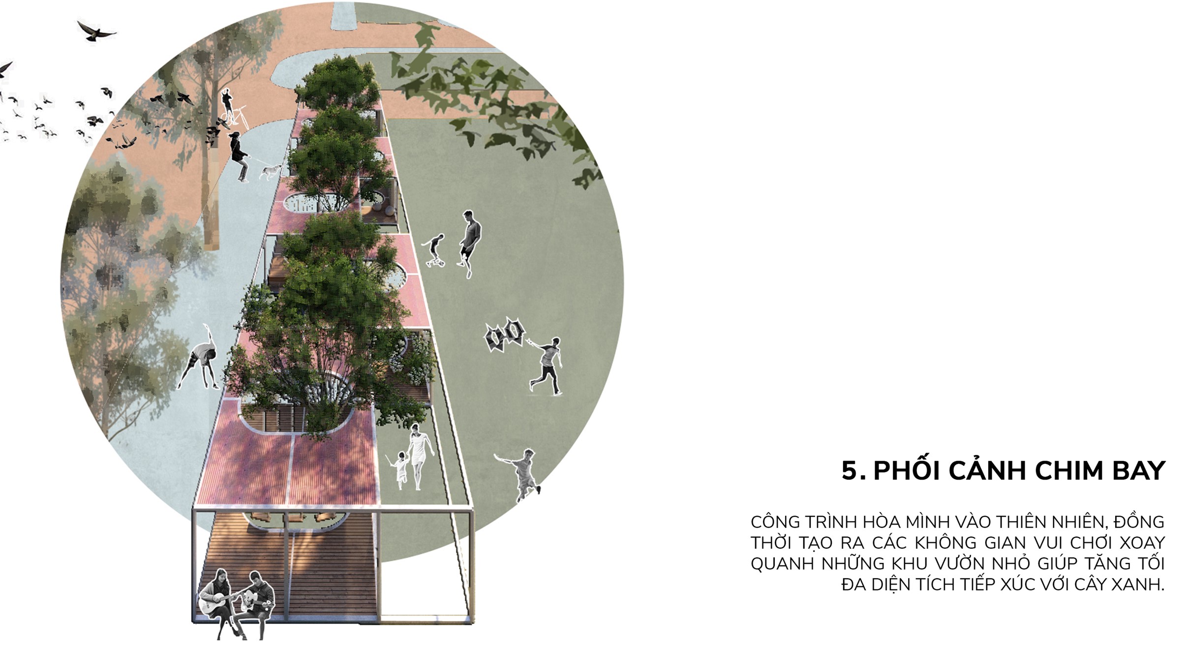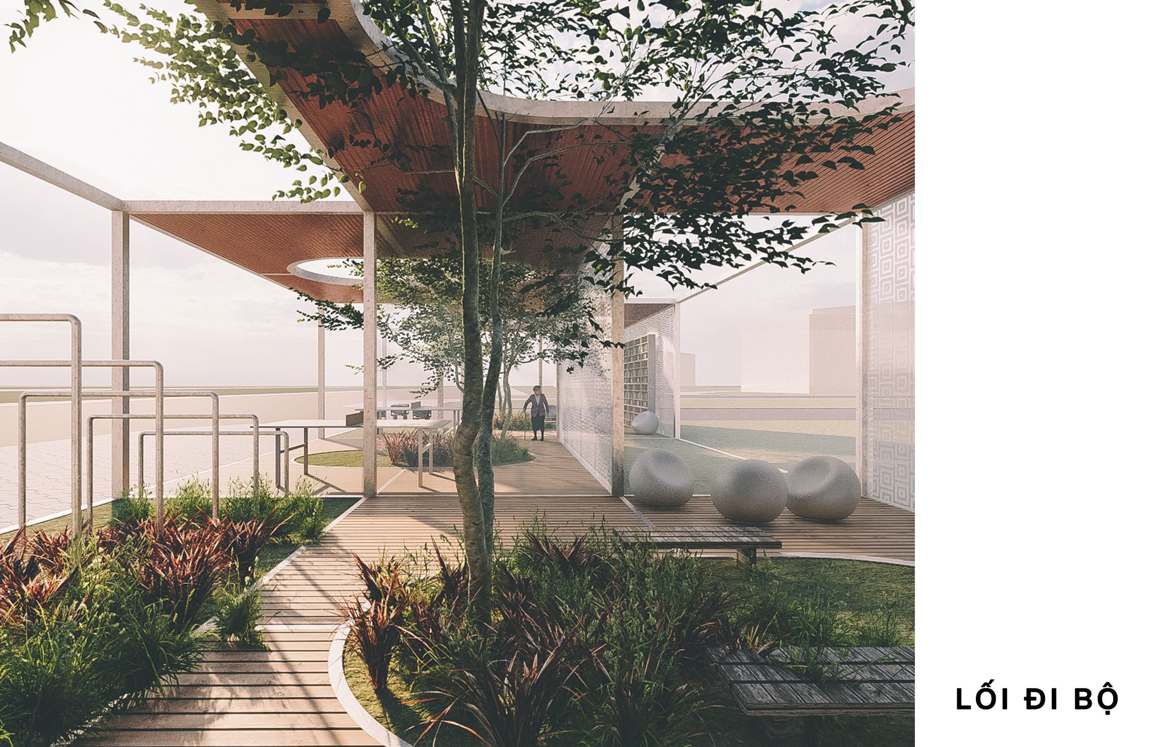 Những chiếc hộp ở đây, được thiết kế phát triển theo chiều ngang, nhằm kết nối con người trở lại với thiên nhiên. Các bức tường xi-măng giờ đây trở thành những chiếc rèm, “vén tường” để gặp gỡ nhau