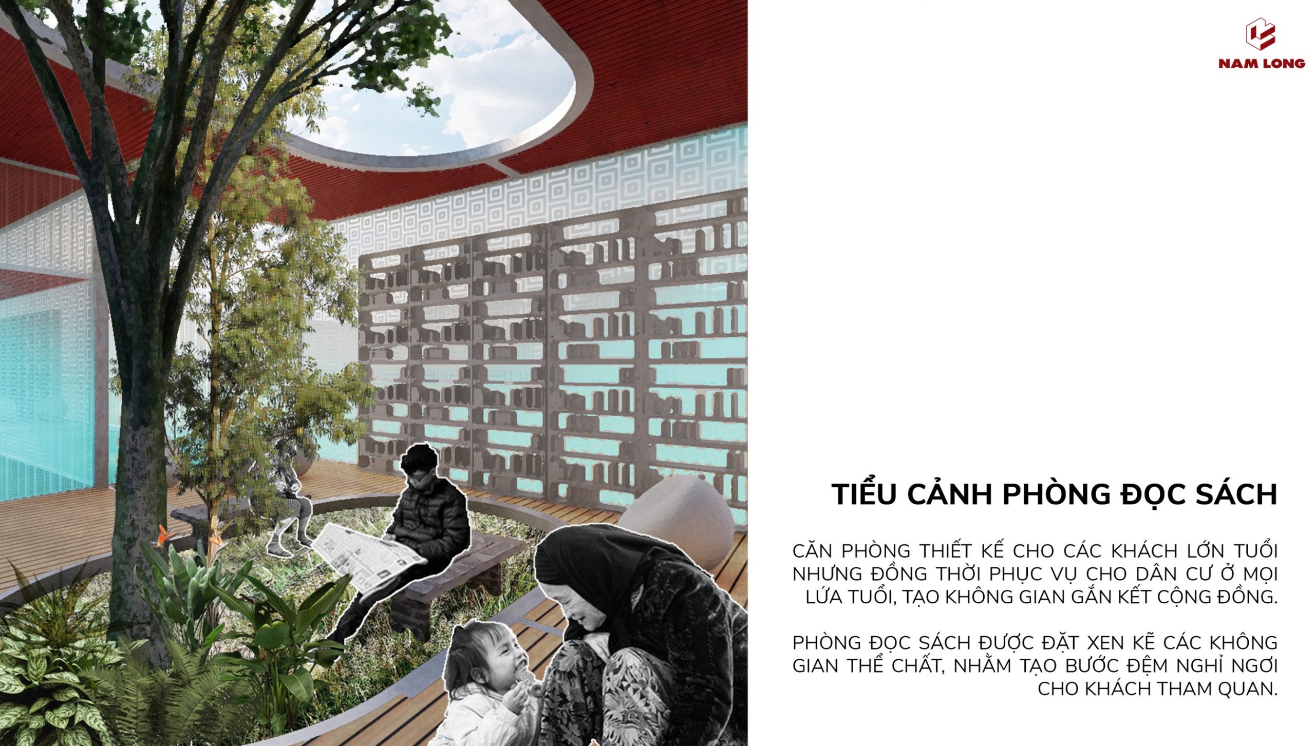 - Phòng đọc sách 1: Thiết kê dành cho trẻ em, sân trước có bố trí các cầu tuột, không gian cần sự giám sát của người lớn.