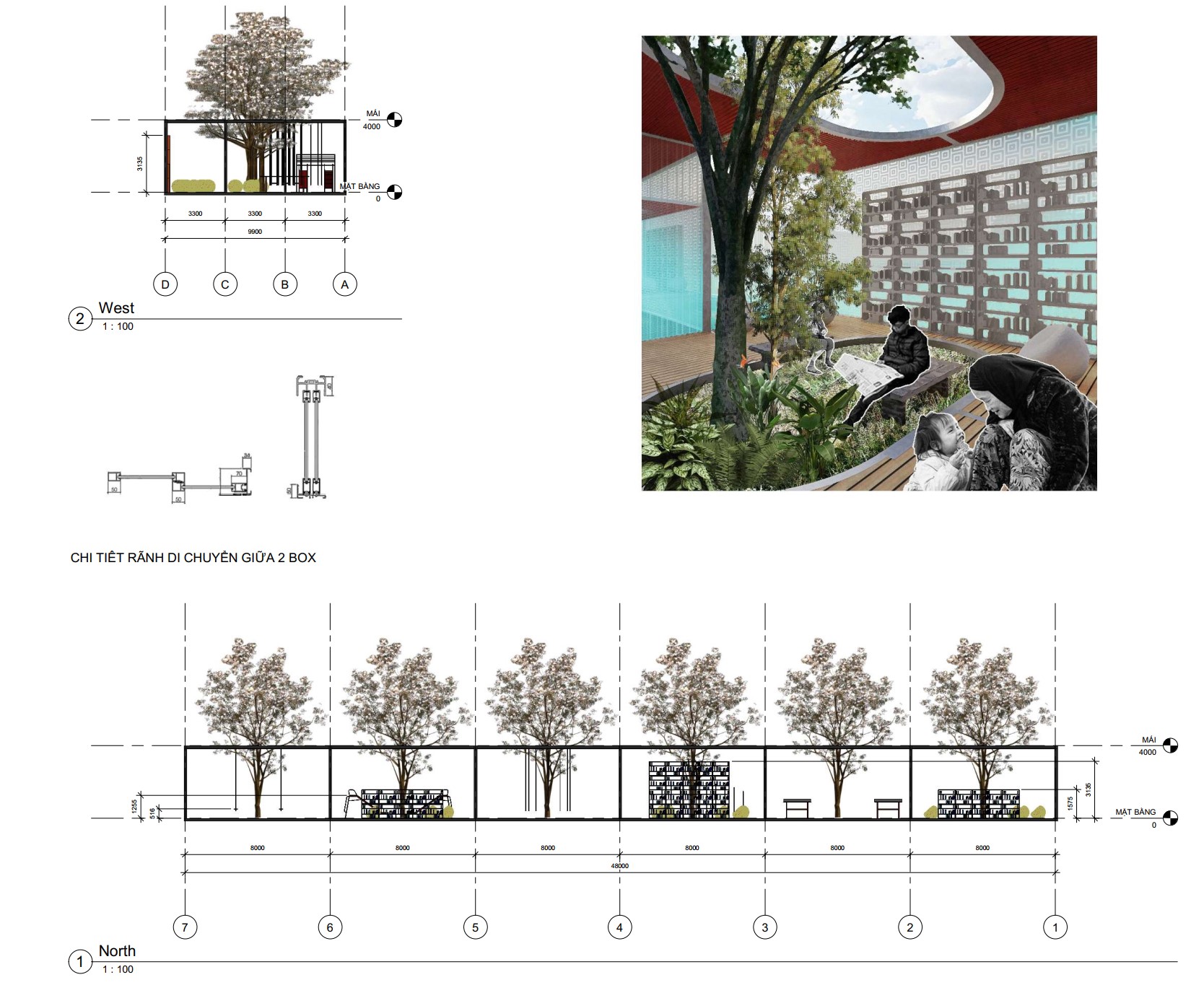 - Phòng đọc sách 2: Thiết kê dành cho thanh thiếu niên, sân trước có bố trí thanh xà tập luyện thể lực.
