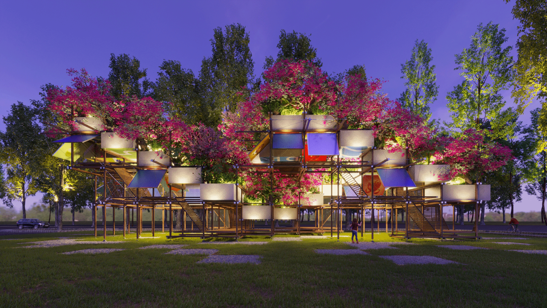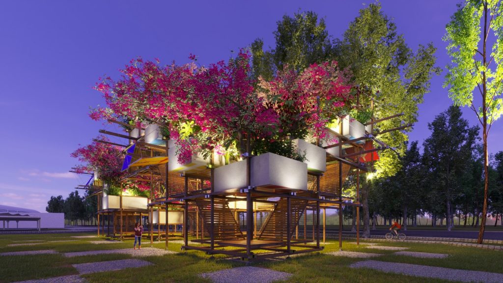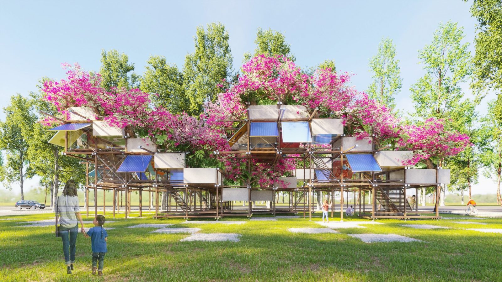 Điểm nhấn của công trình là các chậu cây đan xen trong hệ khung gỗ và lớp vỏ là các tấm solar panel có thể lật mở khi sử dụng. Công trình không chỉ là một khu vui chơi đơn thuần mà còn mang tính giáo dục cho trẻ em về môi trường, tăng tính kết nối công trình – con người – thiên nhiên.