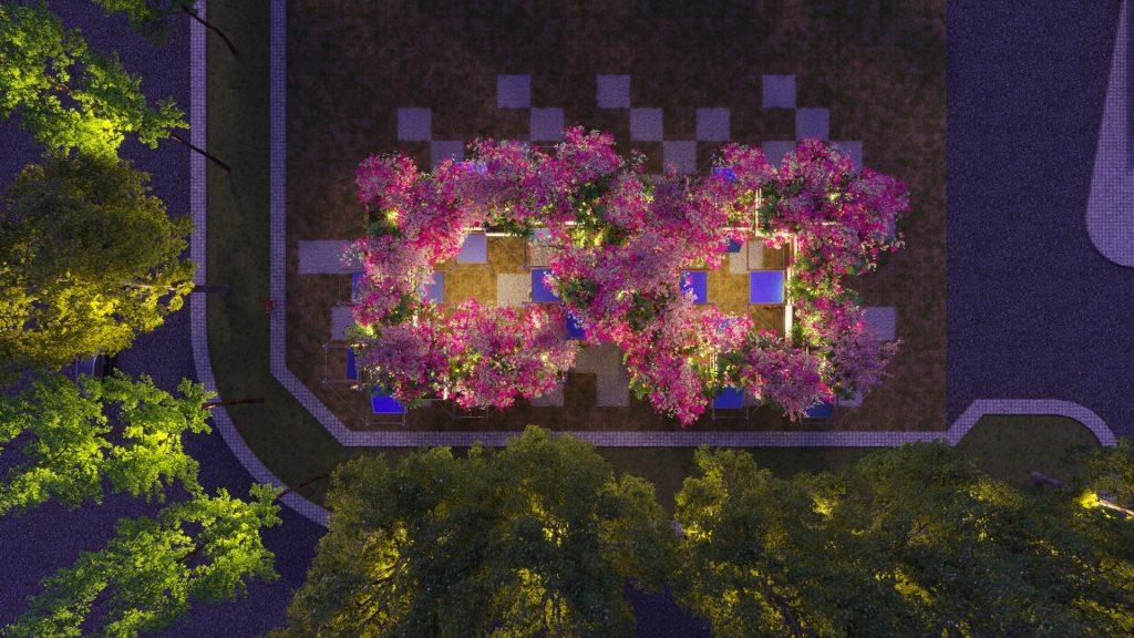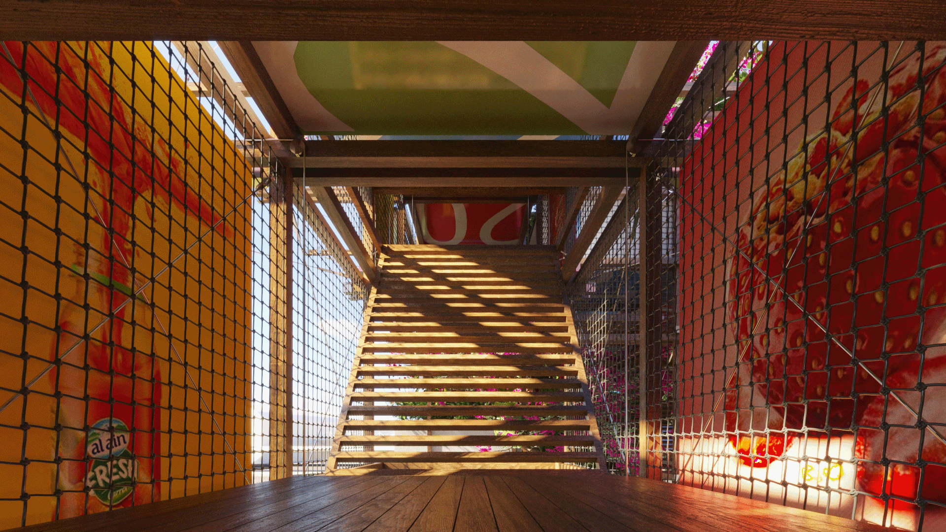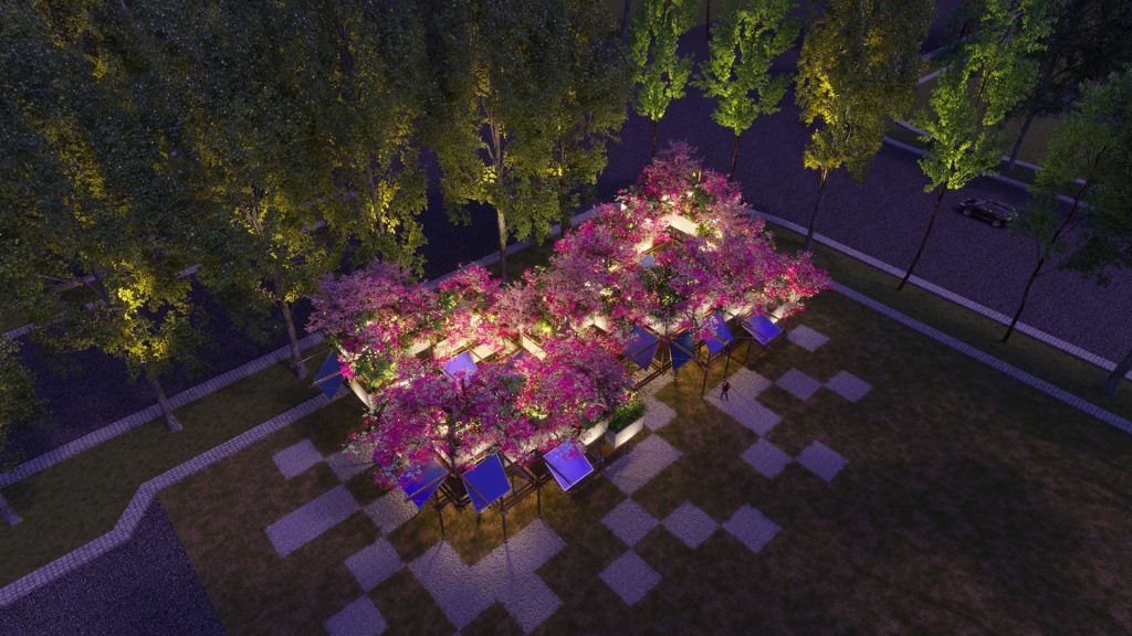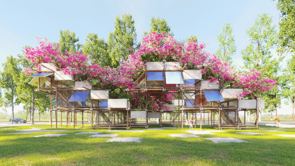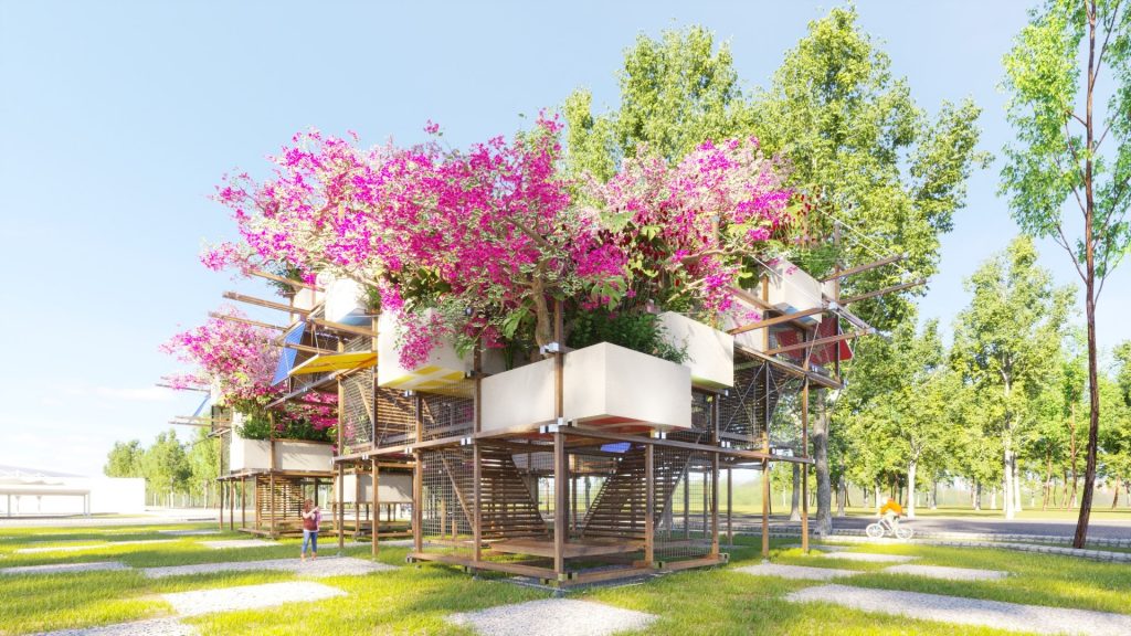 Điểm nhấn của công trình là các chậu cây đan xen trong hệ khung gỗ và lớp vỏ là các tấm solar panel có thể lật mở khi sử dụng. Công trình không chỉ là một khu vui chơi đơn thuần mà còn mang tính giáo dục cho trẻ em về môi trường, tăng tính kết nối công trình – con người – thiên nhiên.