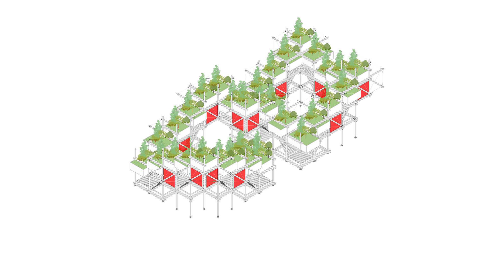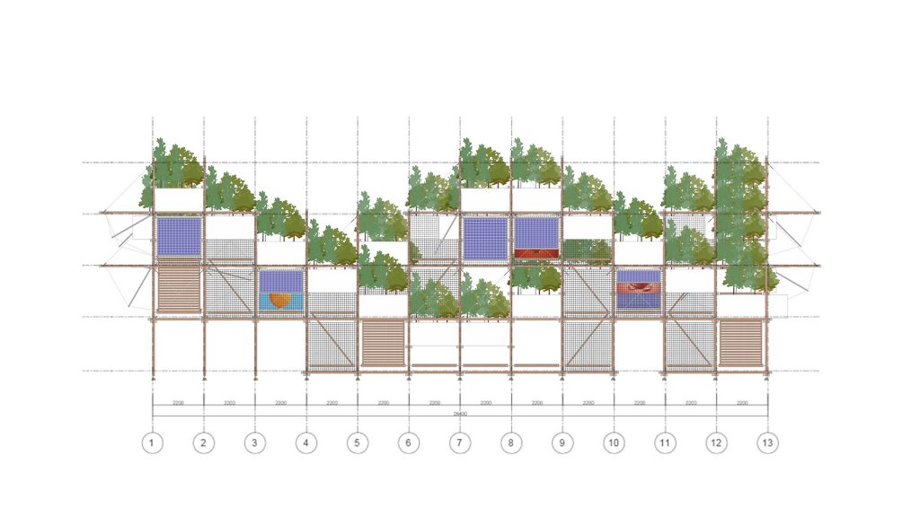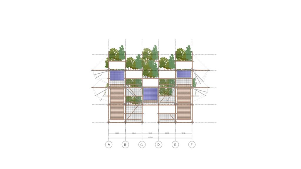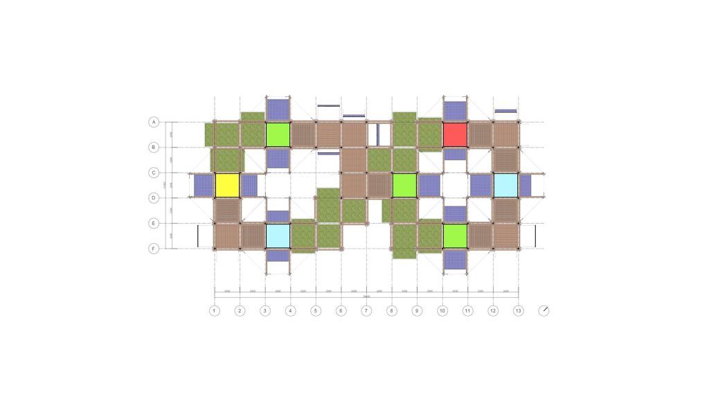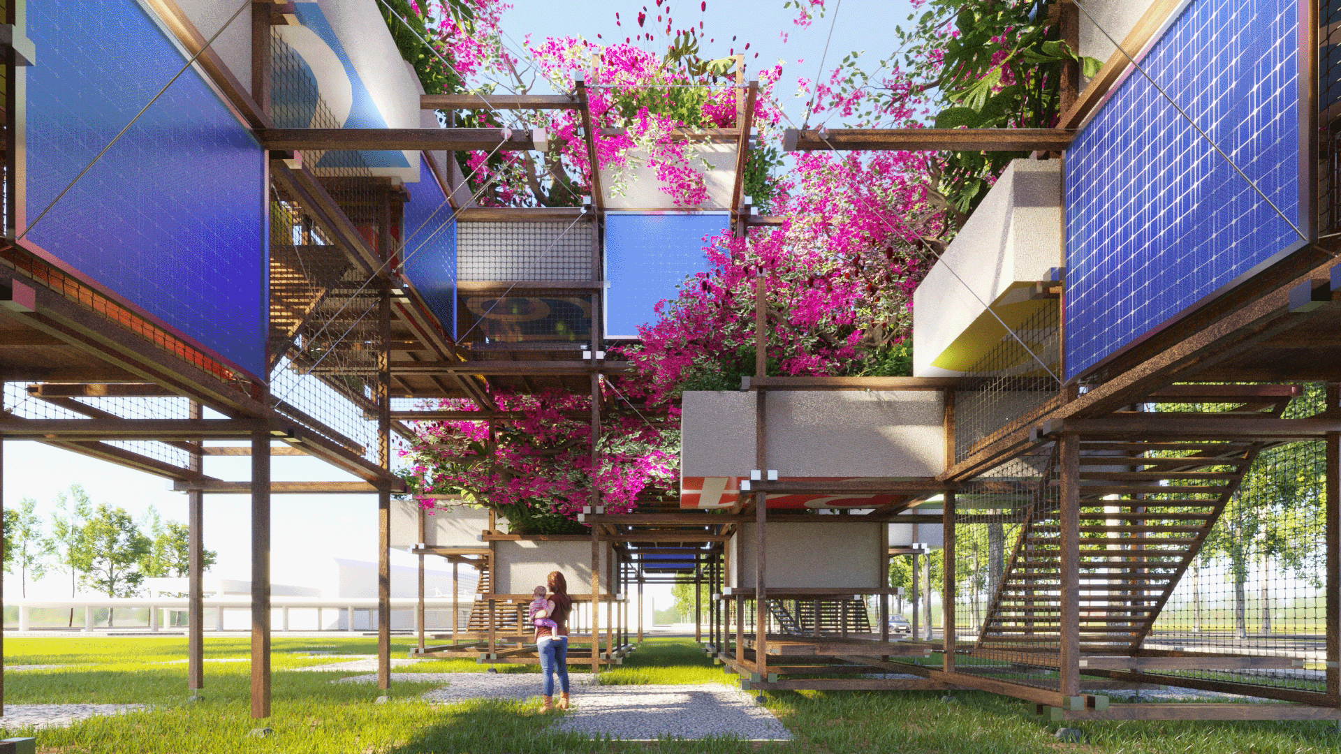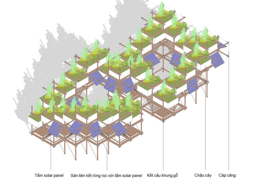 Phối cảnh tổng thể Phối cảnh góc (ngày) Tăng sự tương tác công trình với con người qua hệ ròng rọc kết nối sàn và các tấm bao che Các tấm solar panel lật mở vừa tạo năng lượng sạch vận hành công trình vừa tăng sự tương tác của con người với công trình Phối cảnh chính – mô phỏng khi các tấm solar panel lật mở khi trẻ em vui chơi trong công trình Chú thích các thành phần công trình Mặt bằng tầng 1 (cote +400 mm so với mặt đất) Mặt bằng tầng 2 (cote +2600 mm so với mặt đất) Mặt bằng tầng 3 (cote +4800 mm so với mặt đất) Mặt bằng mái Mặt đứng chính Mặt đứng bên Phối cảnh chính – mô phỏng khi các tấm solar panel lật mở khi trẻ em vui chơi trong công trình Phối cảnh sân trong – mô phỏng khi các tấm solar panel lật mở khi trẻ em vui chơi trong công trình. Bên dưới các tấm panel có thể tận dụng làm biển quảng cáo hoặc trang trí theo mùa, giúp linh động trong việc tổ chức sự kiện cho cư dân Phối cảnh sân trong – Bên dưới các tấm panel có thể tận dụng làm biển quảng cáo hoặc trang trí theo mùa, giúp linh động trong việc tổ chức sự kiện cho cư dân Phối cảnh đường chạy bên trong Phối cảnh góc (đêm) Phối cảnh tổng thể