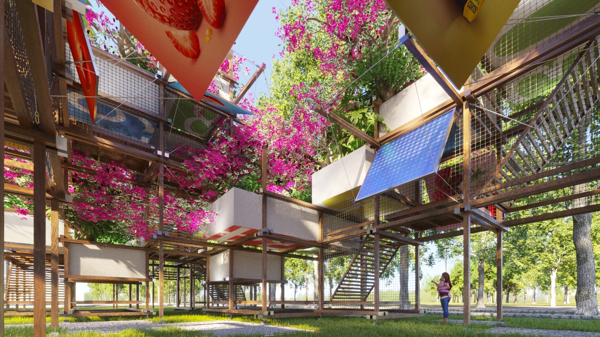Điểm nhấn của công trình là các chậu cây đan xen trong hệ khung gỗ và lớp vỏ là các tấm solar panel có thể lật mở khi sử dụng. Công trình không chỉ là một khu vui chơi đơn thuần mà còn mang tính giáo dục cho trẻ em về môi trường, tăng tính kết nối công trình – con người – thiên nhiên.