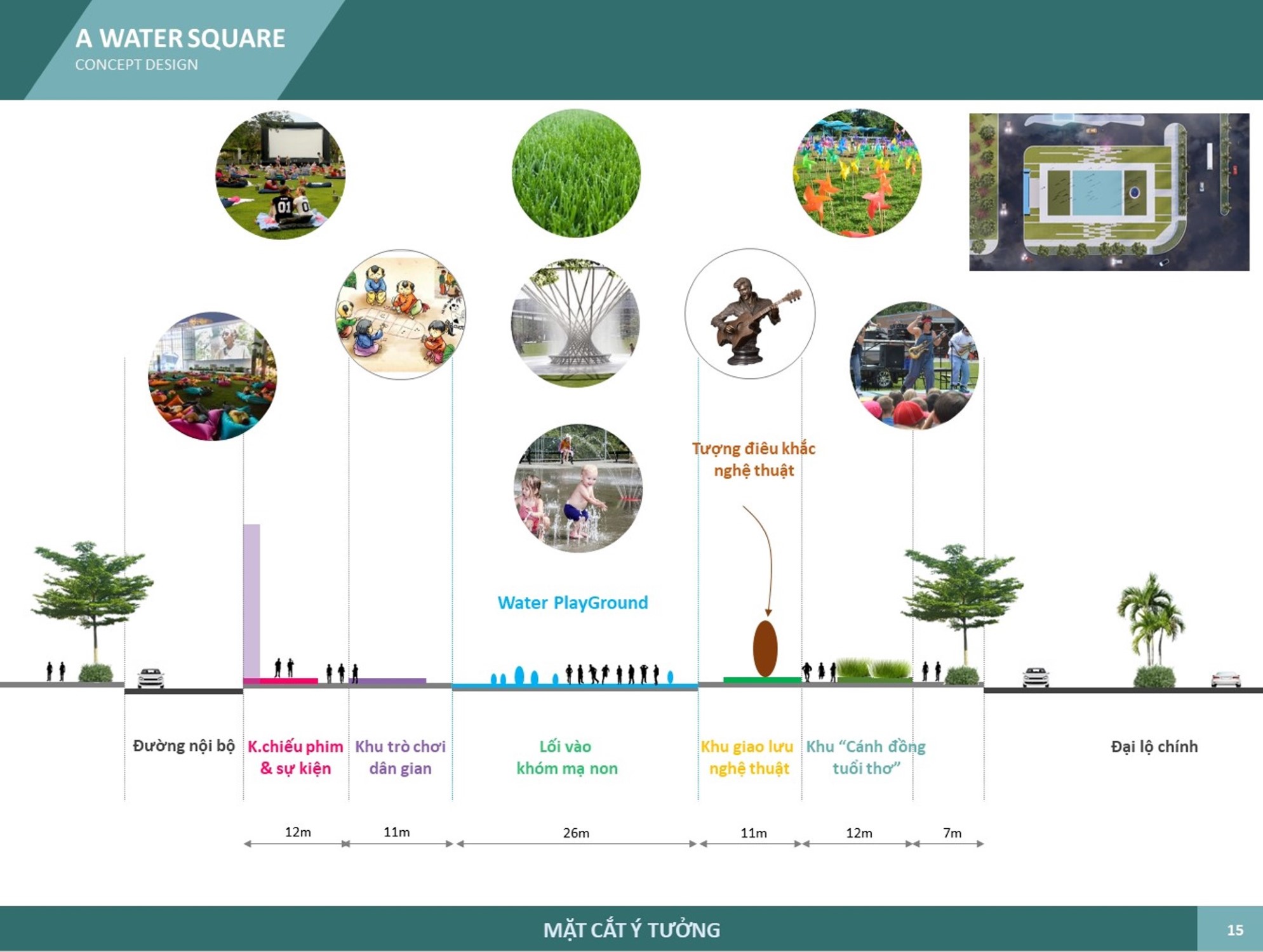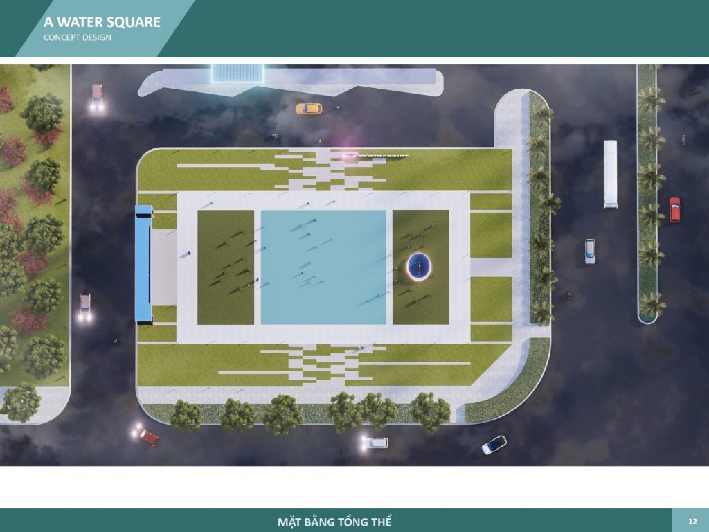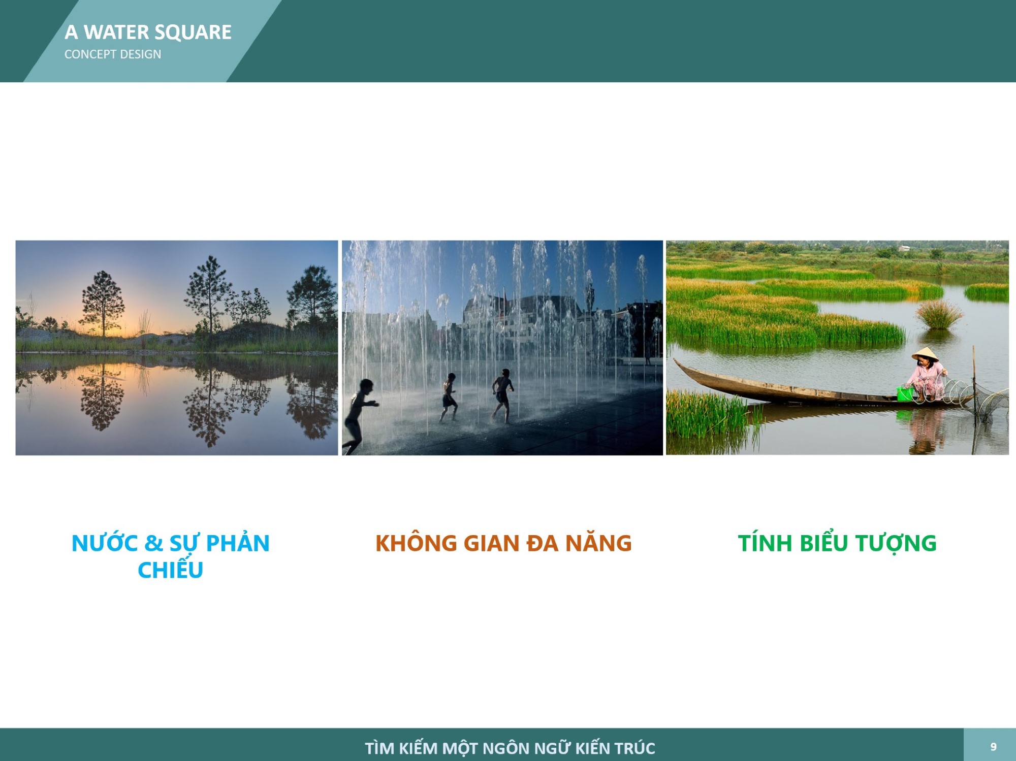 Lấy cảm hứng từ nước và những cánh đồng lúa miền Tây, A Water Square ví như một quảng trường nước khơi gợi những kí ức của một thời tuổi thơ; nơi đó có những cánh đồng mạ non, có những tiếng nô đùa và những trò chơi dân gian ùa về nơi miền quê thanh bình.