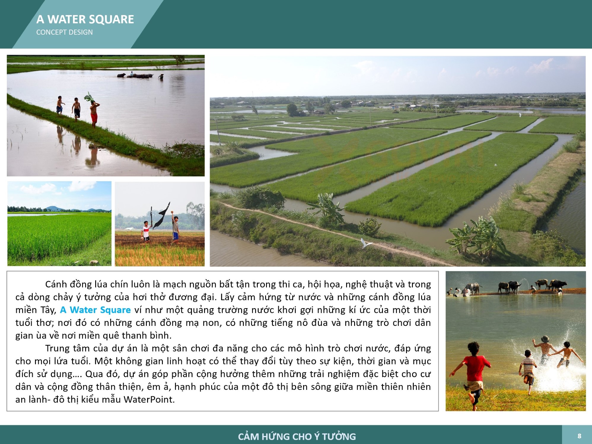 Cánh đồng lúa chín luôn là mạch nguồn bất tận trong thi ca, hội họa, nghệ thuật và trong cả dòng chảy ý tưởng của hơi thở đương đại. Lấy cảm hứng từ nước và những cánh đồng lúa miền Tây, A Water Square ví như một quảng trường nước khơi gợi những kí ức của một thời tuổi thơ; nơi đó có những cánh đồng mạ non, có những tiếng nô đùa và những trò chơi dân gian ùa về nơi miền quê thanh bình.