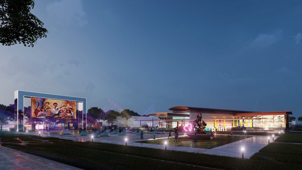 Phối cảnh đêm nhìn về khu chiếu phim và sự kiện – sân chơi khi rút nước