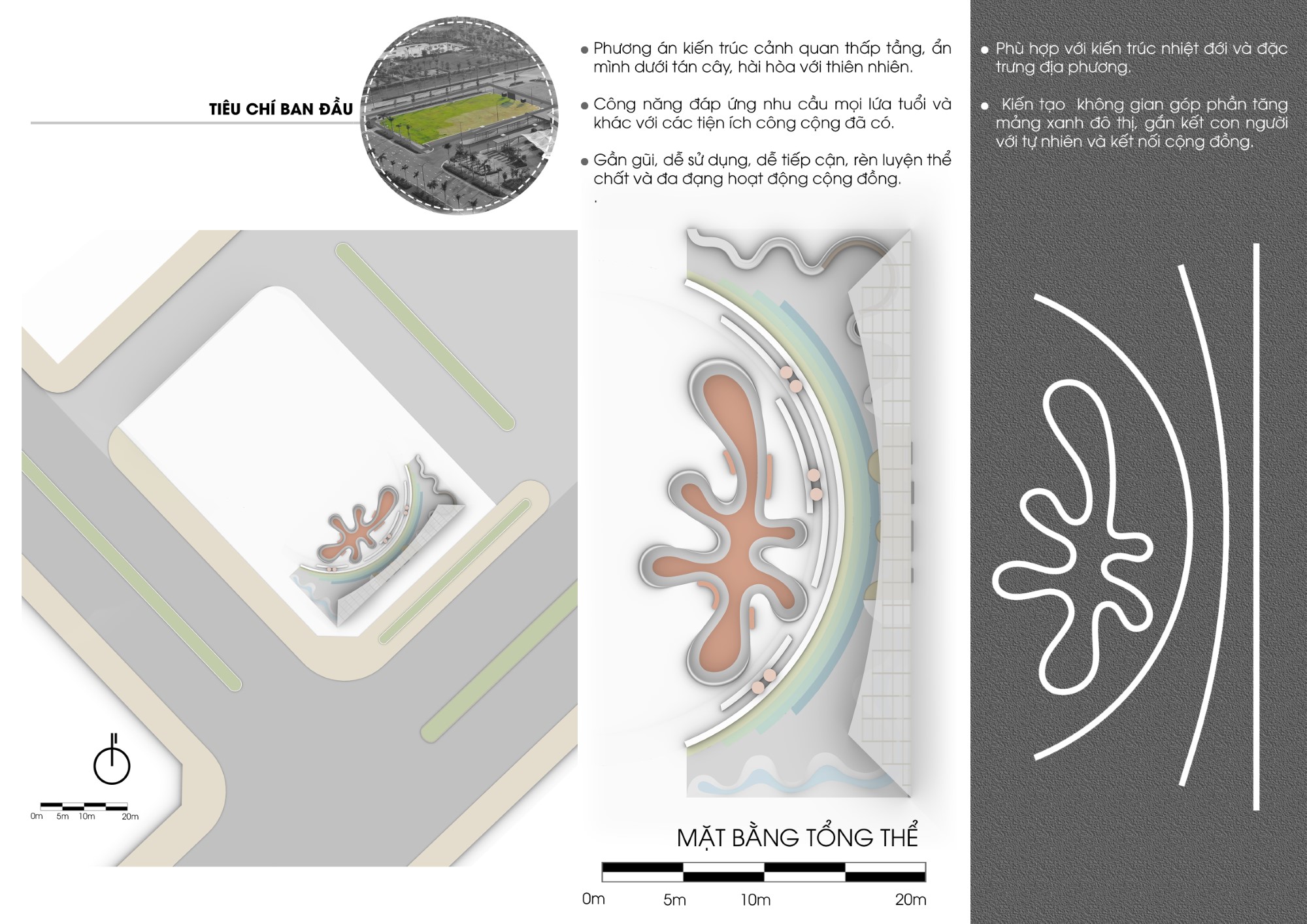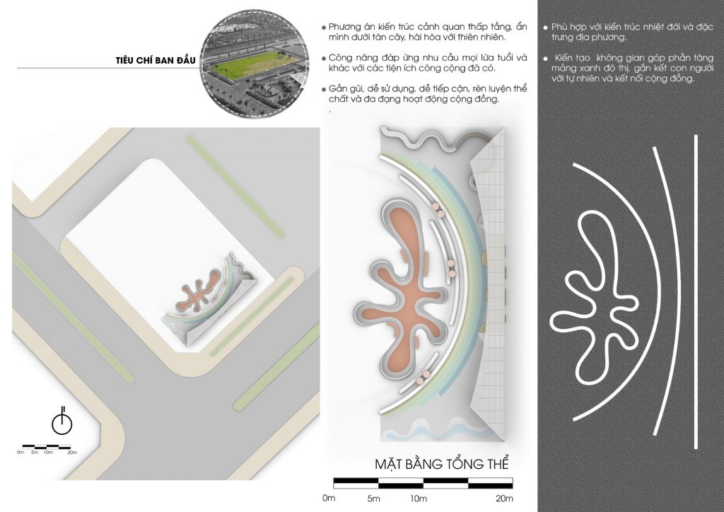 - Phương án kiến trúc cảnh quan thấp tầng, ẩn mình dưới tán cây, hài hòa với thiên nhiên.