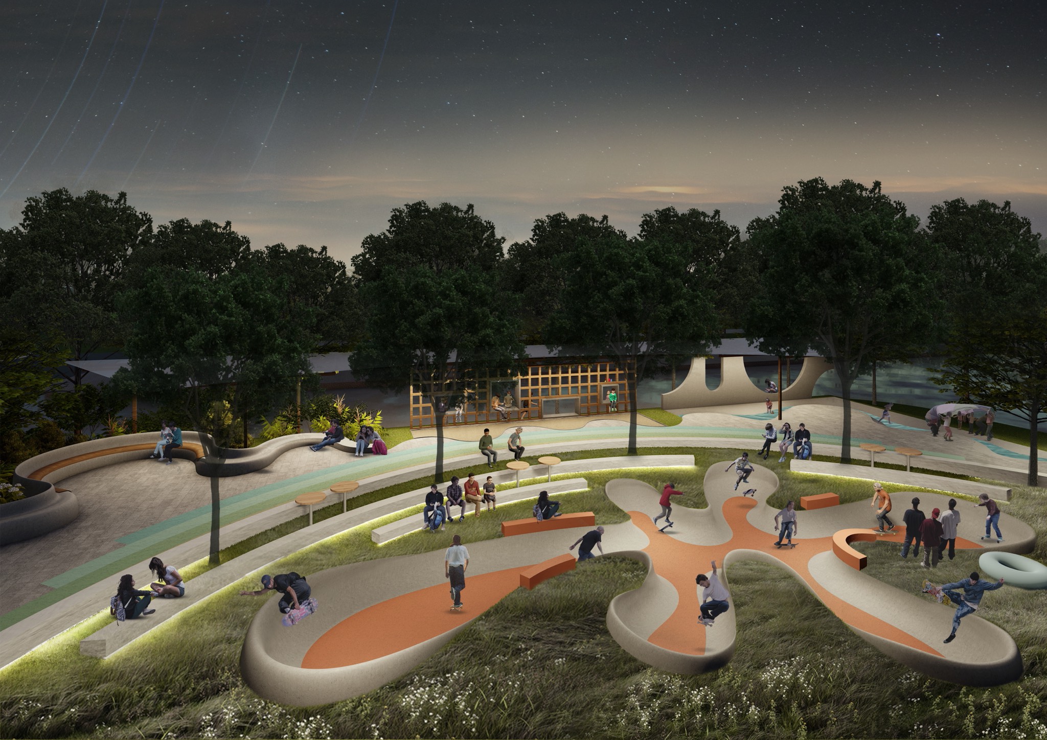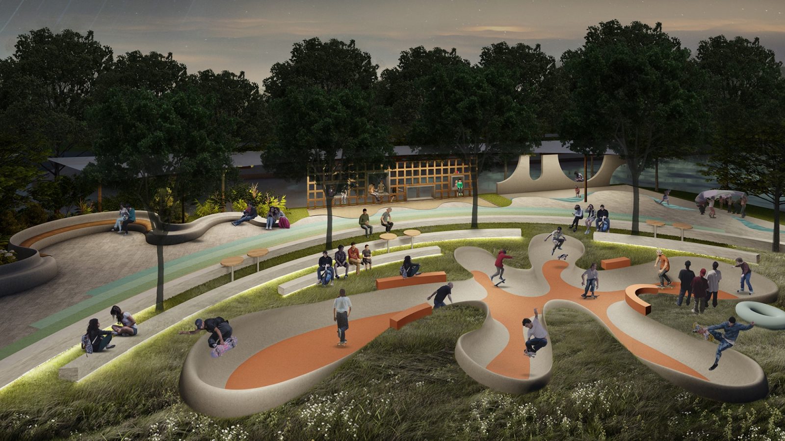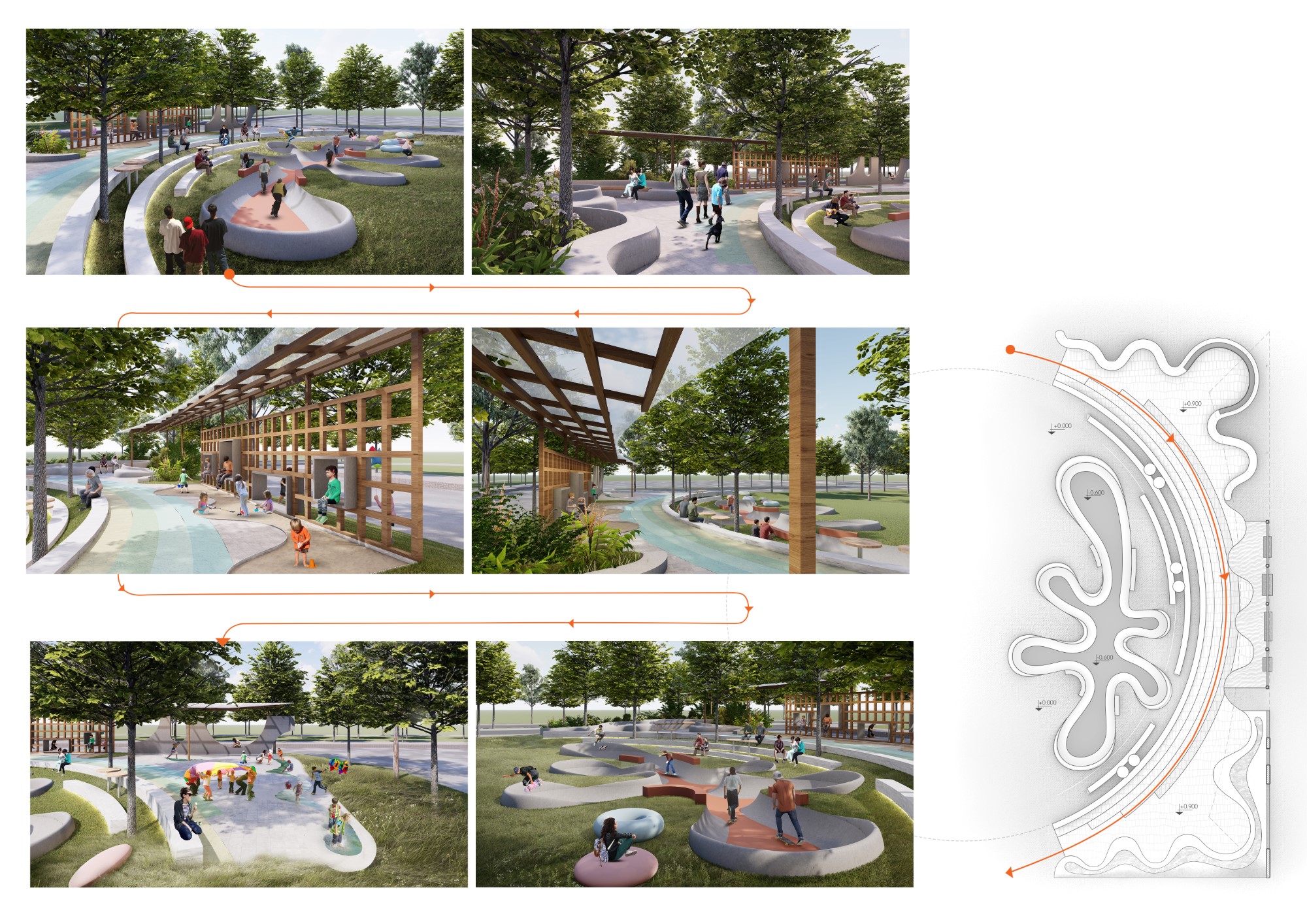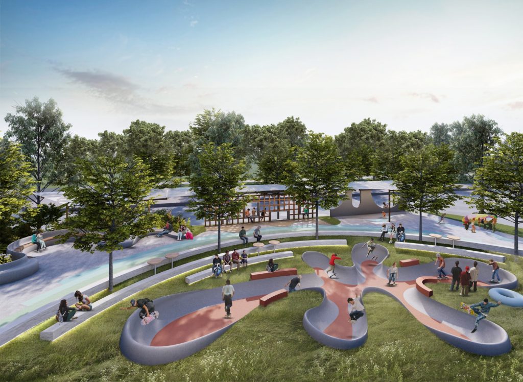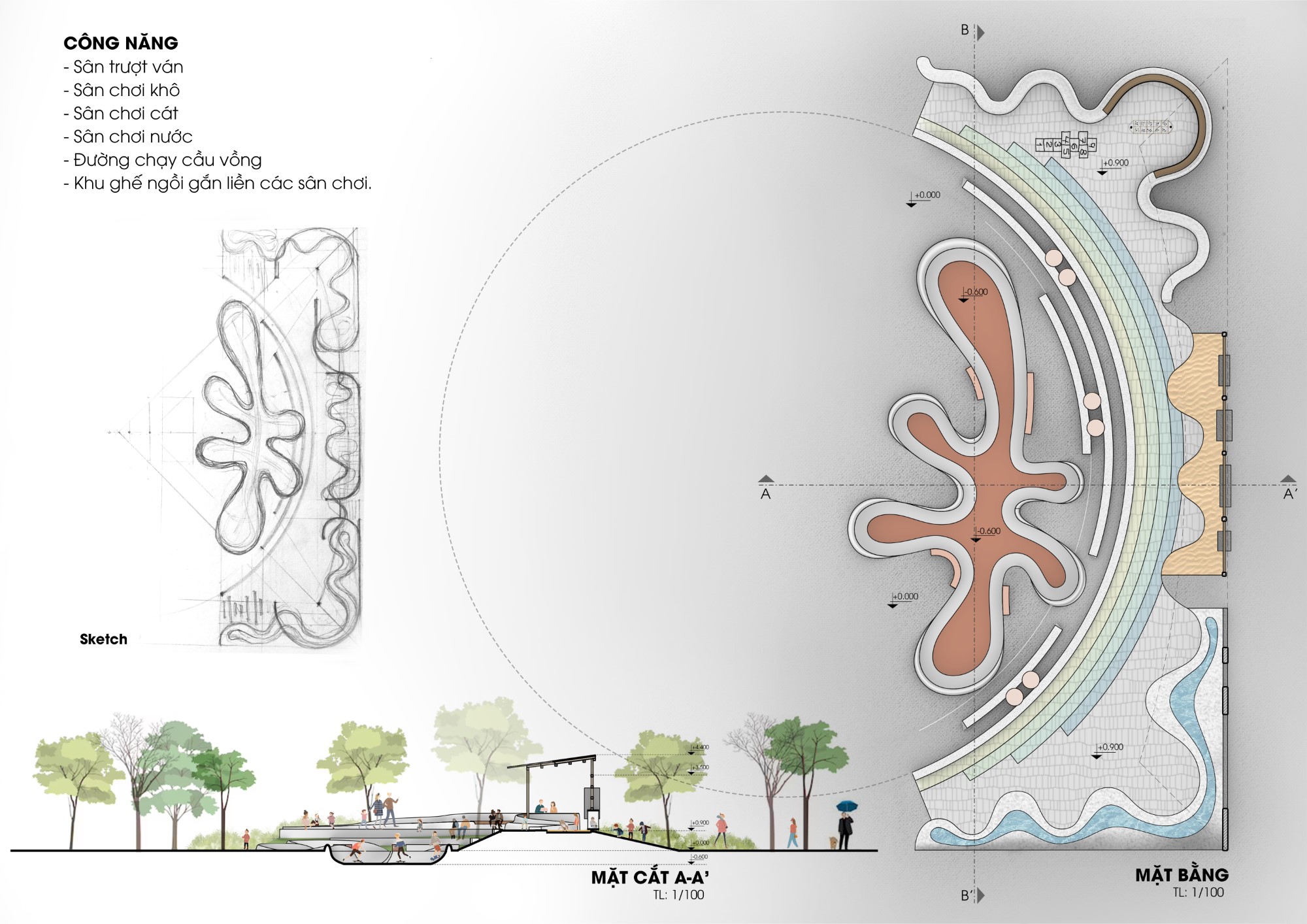 Sân trượt ván – Sân chơi khô – Sân chơi cát – Sân chơi nước – Đường chạy cầu vồng – Khu ghế ngồi gắn liền các sân chơi.